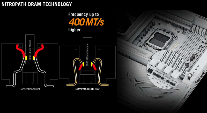 ASUS에 따르면 NitroPath DRAM이 적용된 슬롯은 슬롯 고정력(retention force)이 최대 57% 향상돼, 고클럭 DDR5 모듈 사용 시 물리적 안정성도 함께 확보된다. 일부 환경에서는 공식 수치인 400 MT/s를 넘어서는 성능 향상도 가능하다고 설명했다.
