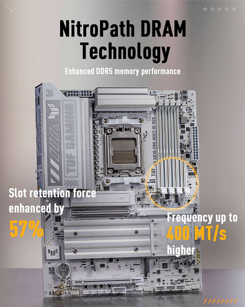 특히 TUF Gaming X870-PRO NEO는 메인스트림 라인업임에도 NitroPath DRAM을 적용받아 DDR5 메모리 오버클러킹 여력이 크게 개선된다. NitroPath DRAM 기술은 더 짧은 골드 핑거 핀과 최적화된 신호 경로 설계를 통해 DRAM과 CPU 간 데이터 전송 효율을 높인다. 이를 통해 신호 무결성과 안정성이 향상되며, 메모리 오버클러킹 한계도 함께 올라간다.