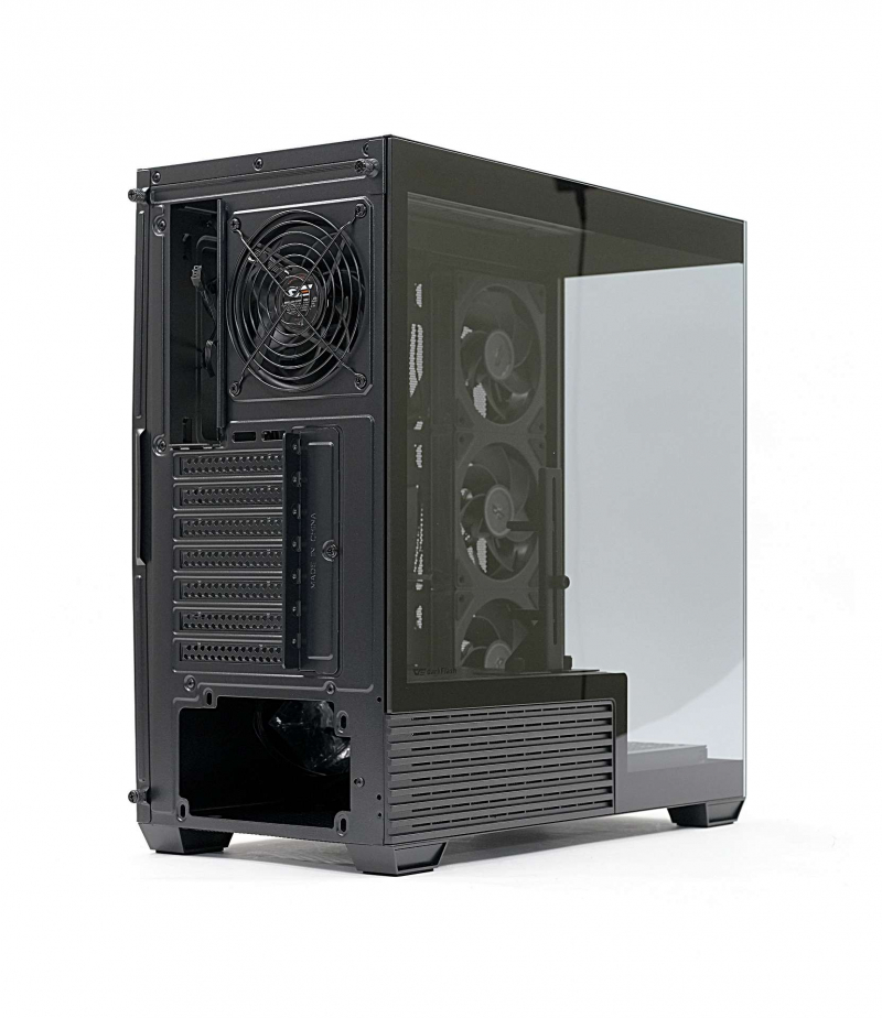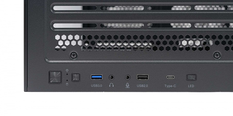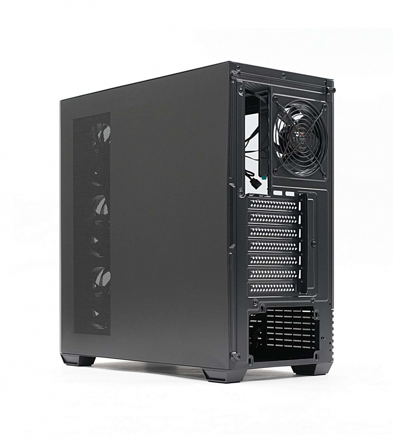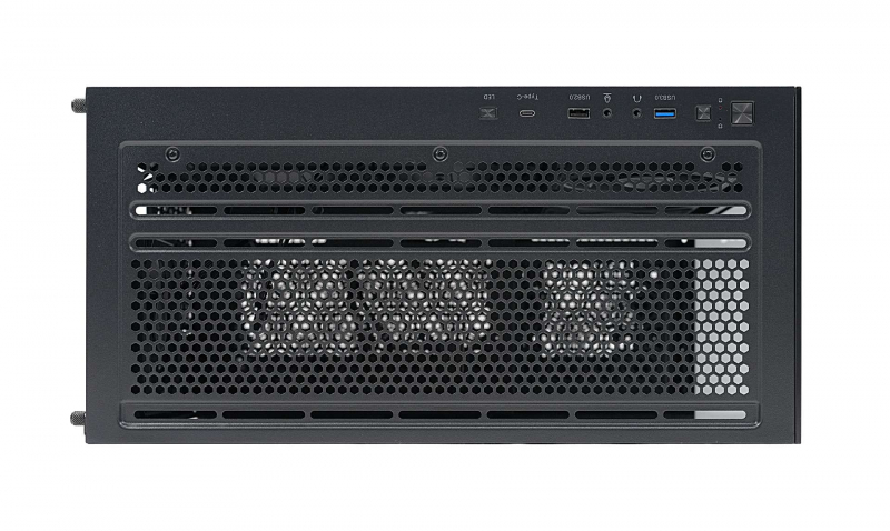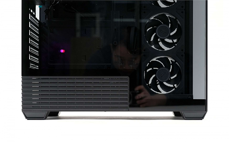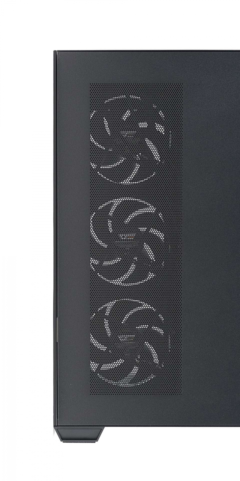 통기 설계도 같은 연장선에서 읽힌다. 강화유리 전면은 메쉬처럼 정면 흡기에 기대기 어렵기 때문에, 흡기와 배기의 경로를 측면·하단·후면으로 설계해 공기 흐름을 만들어야 한다. DS900 PRO ARGB는 측면 에어홀, 하단 PSU 챔버 측면 에어홀, 후면 그릴형 에어홀로 흐름을 확보했다. 흥미로운 지점은 ‘기능을 기능처럼 보이게’ 두지 않았다는 것이다. 면 분할과 패턴으로 정리해 에어홀이 외형을 해치지 않도록 처리했고, 결과적으로 통기를 위한 홀과 그릴이 외형을 구성하는 요소로 자연스럽게 자리 잡았다. 통풍을 위한 구조가 겉에서 ‘붙인 느낌’으로 튀지 않는다는 건, 파노라믹 케이스에서 꽤 중요한 완성도다.
