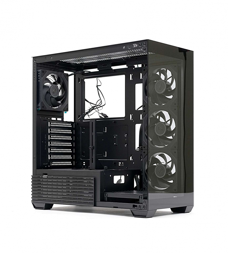 DS900 PRO ARGB의 기본 방향은 ‘파노라믹 강화유리 케이스가 왜 유행인가?’라는 질문에 대한 답이다. 전면과 측면을 강화유리로 구성해 내부를 크게 드러내는 방식은 이제 흔한 문법이 됐지만, 완성도는 여전히 “얼마나 제대로 구현했는가”에서 갈린다. 유리 면적을 넓게 확보하면서도 시야를 끊는 요소를 최소화해 내부가 한 번에 읽히는 구도를 만드는 일. 그게 파노라믹 케이스의 실력이다. 강화유리 특유의 ‘투영감’이 가진 장점을 간섭 없이 살려내는지 여부가 결국 제품의 인상을 좌우한다.