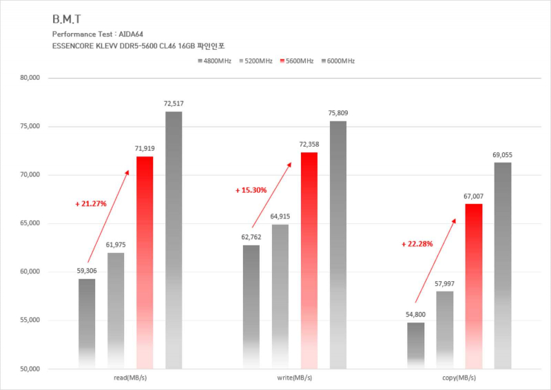 DDR5-5200, DDR5-6000과 비교했을 때의 차이도 의미있다. DDR5-5600은 DDR5-5200 대비 읽기 71,919MB/s, 쓰기 72,358MB/s, 복사 67,007MB/s를 기록하며 각각 약 16.05%, 11.47%, 15.53% 앞섰다. 중간 단계 업클럭 수준으로 보기에는 제법 분명한 격차다. 특히 읽기와 복사 항목에서 5200 대비 상승 폭이 뚜렷해, 시스템 전반의 데이터 이동량이 많은 환경에서 한 단계 상위 티어에 가까운 성능이다.