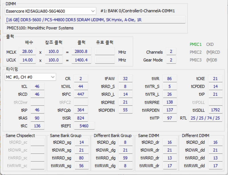 클럭/타이밍 : 5600MHz(PC5-44800) / CL46-46-46-90