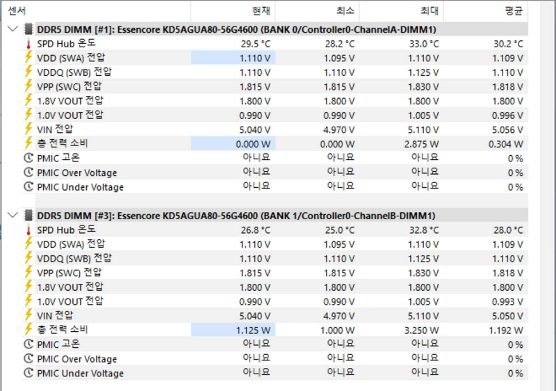 전압 흐름도 전반적으로 안정적이다. 두 모듈 모두 VDD와 VDDQ는 1.110V 수준에서 유지됐고, VPP도 1.815V 안팎으로 큰 흔들림 없이 동작했다. PMIC 온도, 과전압, 저전압 관련 경고 항목 역시 나타나지 않았다. 종합하면 ESSENCORE KLEVV DDR5-5600 CL46 16GB 파인인포는 방열판이 없는 보급형 성격의 메모리임에도 불구하고, 발열과 전력 특성을 모두 무난하게 제어하는 제품이다.
