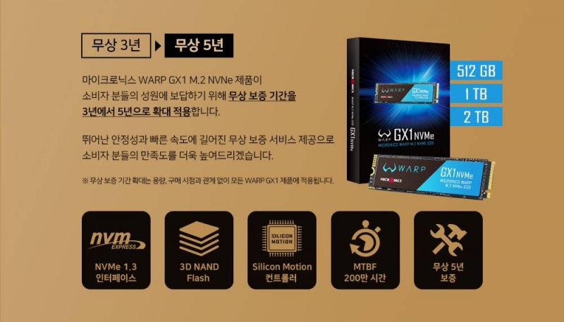 [2021년 11월 26일] - 게이밍 기기 디자인·개발·제조 전문기업 한미마이크로닉스가 자사 유통 SSD 제품 WARP GX1 M.2 NVMe를 대상으로 무상 보증기간을 3년에서 최대 5년으로 확대 적용한다고 알렸다. 무상 보증기간은 구매 기간에 상관없이 동일하게 발표일을 기점으로 진행된다. 사실상 모든 사용자에게 득이되는 결정이다. 회사 관계자는 소비자 만족을 최우선 하자는 의지가 반영된 결과라고 설명한다.