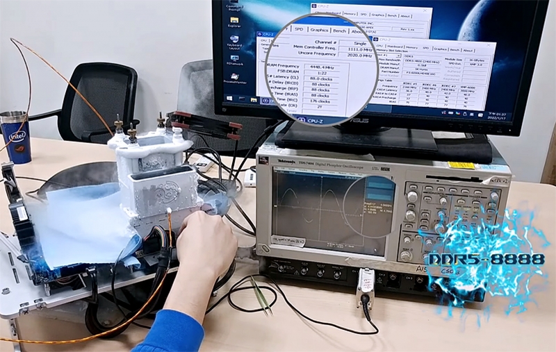 지난해 11월에 세운 동일한 구성으로 세운 8,704MHz, 램타이밍 CL 127-120-120-120 오버클럭 기록을 갱신 한 것. 더 낮게 설정한 램타이밍 CL 88-88-88-88을 기록, 8,888MHz의 동작 클럭을 달성했다. 대역폭으로 환산하면 PC5-71,100에 달한다. DDR4의 마지막 정규 클럭이 3200MHz, DDR5의 정규 클럭이 4800MHz 임을 감안하면 2배에 가까운 수치다.