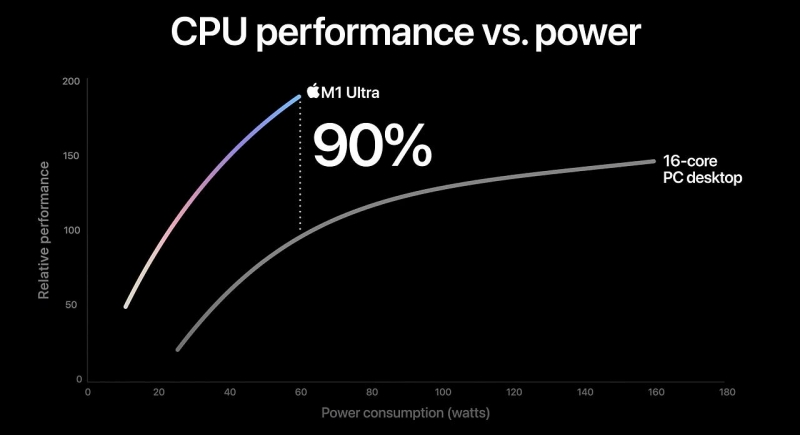 더 놀라운 것은 M1 울트라다. 16코어 데스크톱 대비 같은 전력 구간에서 90% 더 높은 성능을 내는데, 전력은 100W를 덜 쓴다. 충전기 안 넣어준다고 욕을 많이 먹지만, 이런 데서 진짜 환경친화적인 실력을 뽐냈다. 일단 본체가 덜 뜨거우니 만족감은 당연히 높아진다.