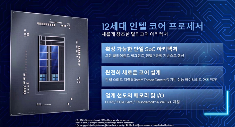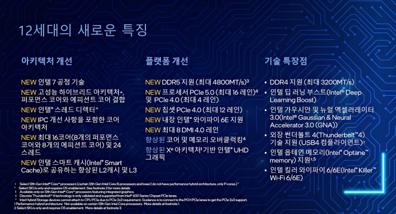 특히 인텔 7 공정이라는 이름으로 명명한 새로운 아키텍처는 10nm 미세 공정으로 11세대 대비 발열 및 성능을 대폭 개선했으며, 2019년부터 이어진 노트북과 데스크톱 간의 공정 불일치를 해소한 점도 의미 있다.