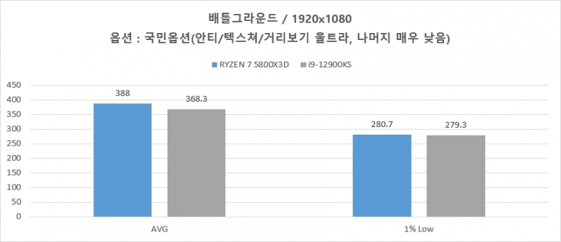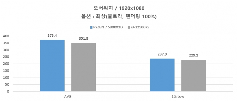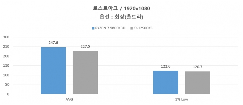세 가지 게임을 테스트 진행한 결과 1) 배틀그라운드에서는 라이젠 7 5800X3D가 i9-12900KS 보다 5% 정도 더 높은 성능을 보여주었다. 2) 오버워치에서는 두 제품 간 큰 차이는 없었지만 라이젠 7 5800X3D가 6% 정도 앞서는 수준의 성능을 기록했다. 3) 로스트아크에서는 i9-12900KS 보다 라이젠 7 5800X3D가 9% 가까이 높은 성능을 발휘했다.