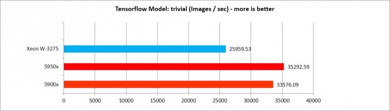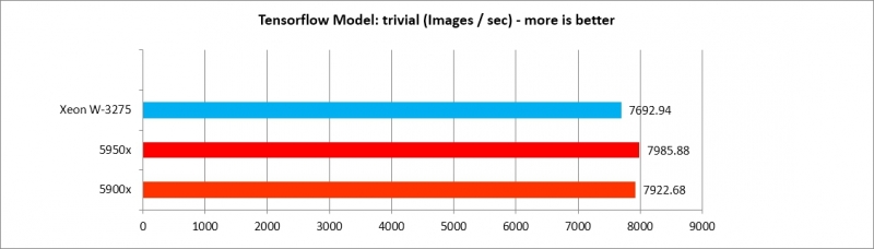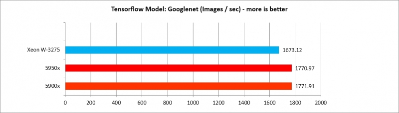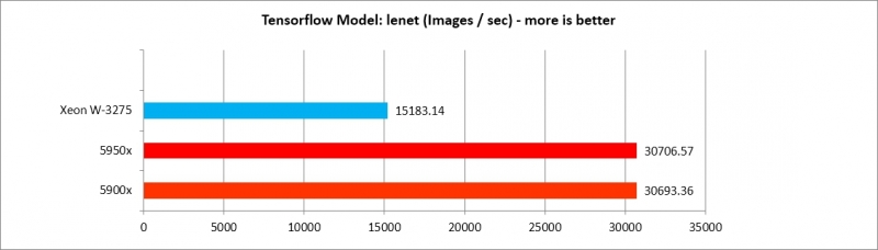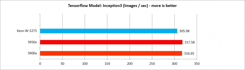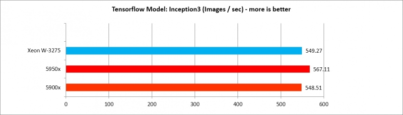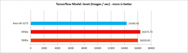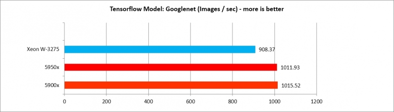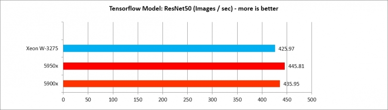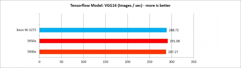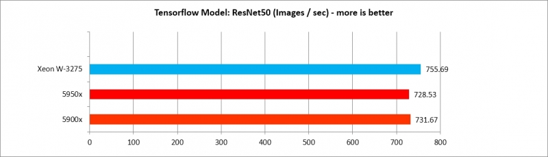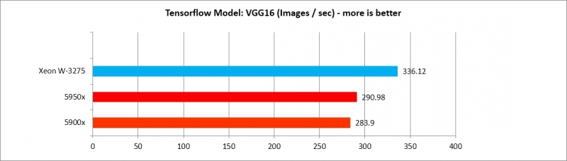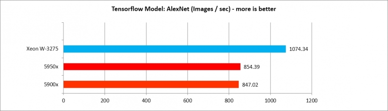5900x, 5950x가 Tensorflow 모델별로 각기 다른 효율을 보여주나, AlexNet, VGG16 두 가지를 제외하면 XEON W3275 프로세서에 뒤지지 않는 수준의 강력한 성능을 보여준다. 따라서 Deep Learning 수행 효율은 매우 가성비가 도드라진다.