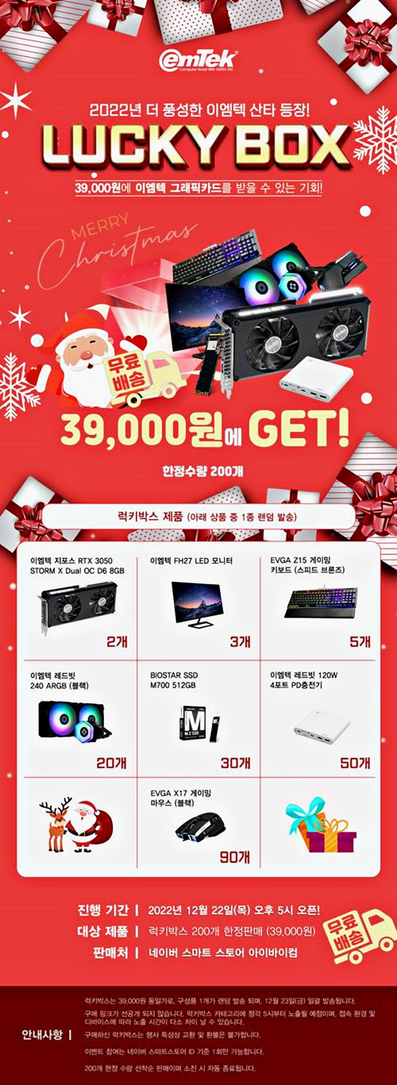 럭키박스 발송은 12월 23일(금)에 일괄 발송되며, 무작위 발송되는 상품은 EVGA X17 마우스, 이엠텍 레드빗 120W GAN 초고속 멀티 PD 충전기, REDBIT 240 ARGB, BIOSTAR SSD M700 512GB, EVGA Z15 게이밍 키보드 한글, 이엠텍 FH27 LED 모니터, 이엠텍 지포스 RTX 3050 그래픽카드 등이다.