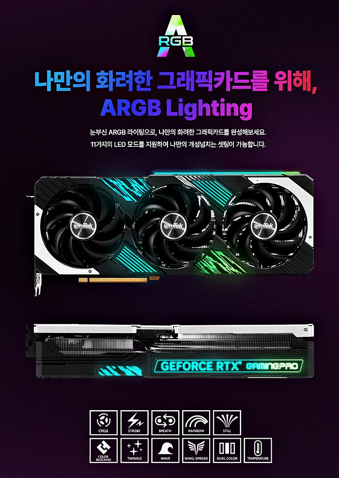 ARGB LED도 적용했다. 쿨러 측면과 지포스 RTX GAMING PRO 로고는 Thunder Master 소프트웨어를 통해 11가지 형태로 세팅할 수 있다. 또한, 동봉된 5V ARGB 케이블을 통해 시스템과 동기화 가능한 것도 특징이다.