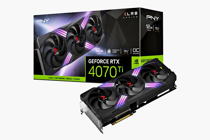 모델명은 2종이며 PNY XLR8 게이밍 지포스 RTX 4070 Ti 베르토 EPIC-X RGB 12GB 트리플 팬과 PNY 지포스 ‘RTX 4070 Ti 베르토 12GB 트리플 팬으로 나뉜다. 발열에 측화한 대형 냉각팬 3개와 방열판 디자인이 시선을 끈다.