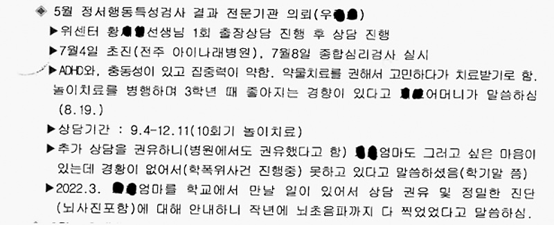 △ 이미 5월에 가해 학생이 ADHD 및 치료가 필요하다는 것을 학교와 부모가 인지한 정황