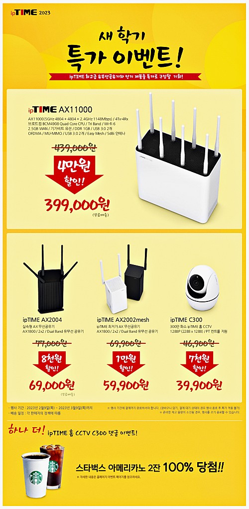 이에프엠네트웍스가 아이피타임 제품을 대상으로 신학기 특가 이벤트를 진행한다. 대상 제품은 총 4종이다. 플레그십 모델 AX11000을 포함 802.11ax(와이파이6)공유기 AX2004, AX2002MESH, 300만 화소 홈 CCTV C300 모델이다. 기한은 내달 3월 9일까지 진행한다.