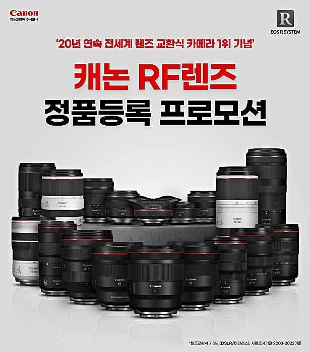 캐논코리아가 렌즈 교환식 카메라 시장 20년 연속 판매량 1위를 기념해 RF렌즈 정품등록 프로모션을 실시한다. 행사 렌즈를 오는 4월 30일까지 구매한 구매자에게는 ▲캐논 정품 렌즈 후드 ▲백화점 상품권 등 사은품을 제공받을 수 있다. 사은품은 구매 제품별 상이하며, 일부 제품의 경우 한정 수량으로 재고 소진 시까지 증정한다. 단, 5월 8일까지 정품등록이 필수다.