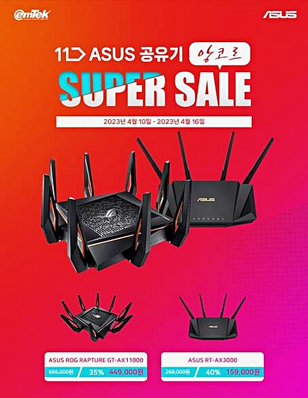 오는 16일까지 이엠텍은 자사 유통 ASUS 공유기 제품을 대상으로 최대 40% 할인 혜택을 지급하는 11번가 슈퍼세일 프로모션을 진행한다.