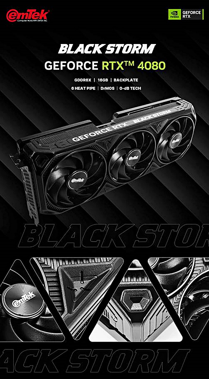 이엠텍 RTX 4080 BLACK STORM 그래픽카드는 구리 재질 베이스와 6개의 히트 파이프로 냉각한다. 90mm 트리플 GALE HUNTER 팬은 더 향상된 풍압과 풍량을 생성하고 방열판 끝부분을 Y FORMULA FIN 가공 처리해 통기 효율을 높였다. GPU, 메모리 온도와 전력 소모량에 따라 스마트하게 작동하는 0-dB 팬도 주목할 부분이다.