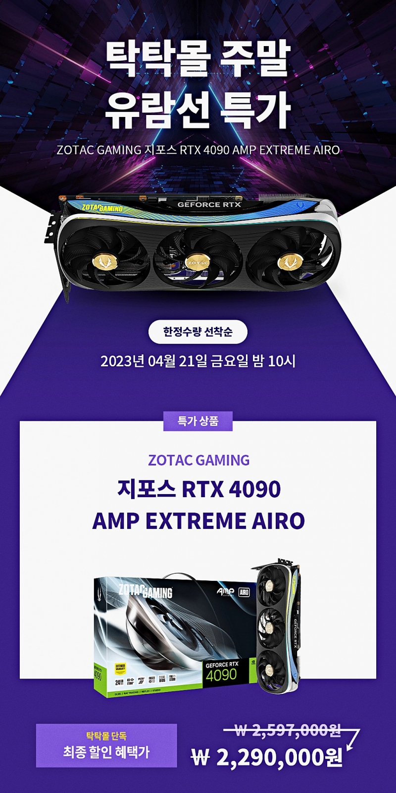 주말에 판매되는 제품은 유니크한 유람선 디자인이 특징인 ZOTAC GAMING 지포스 RTX 4090 AMP Extreme AIRO 그래픽카드다. 행사 기간동안 할인가 적용한 229만 원에 판매 진행한다.