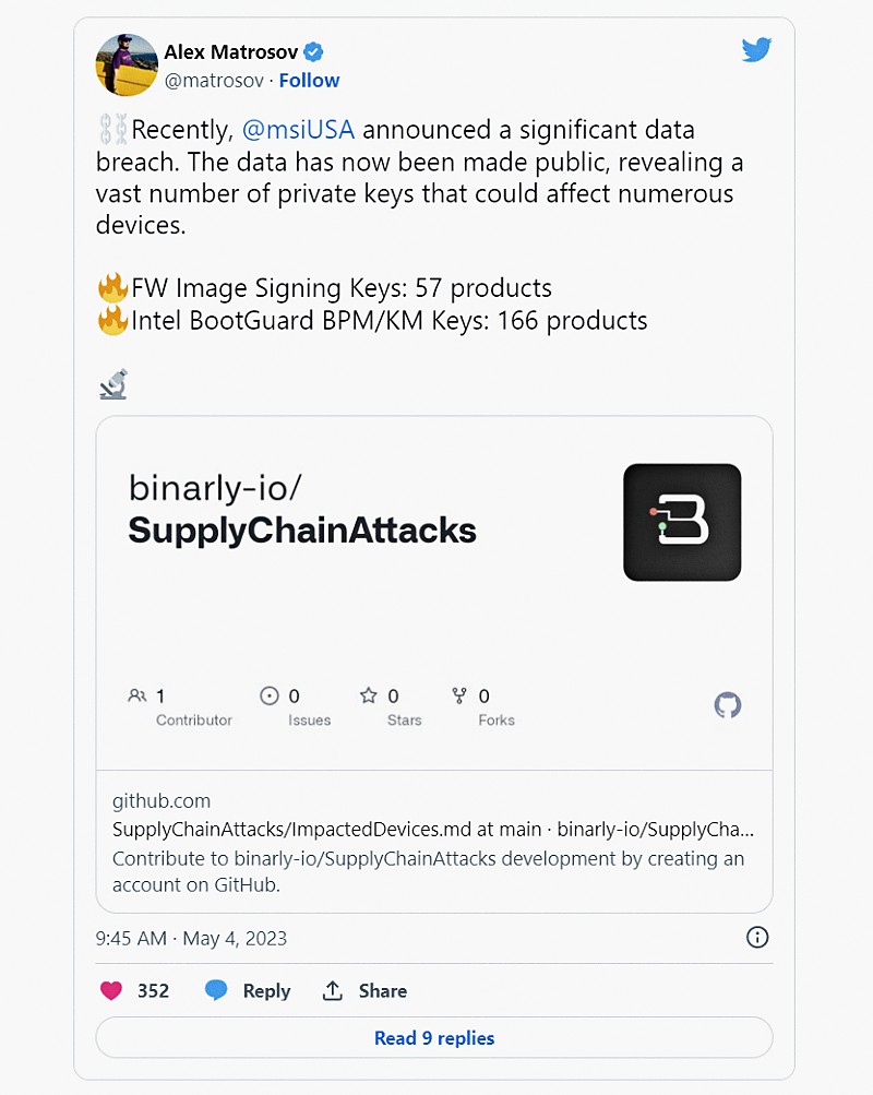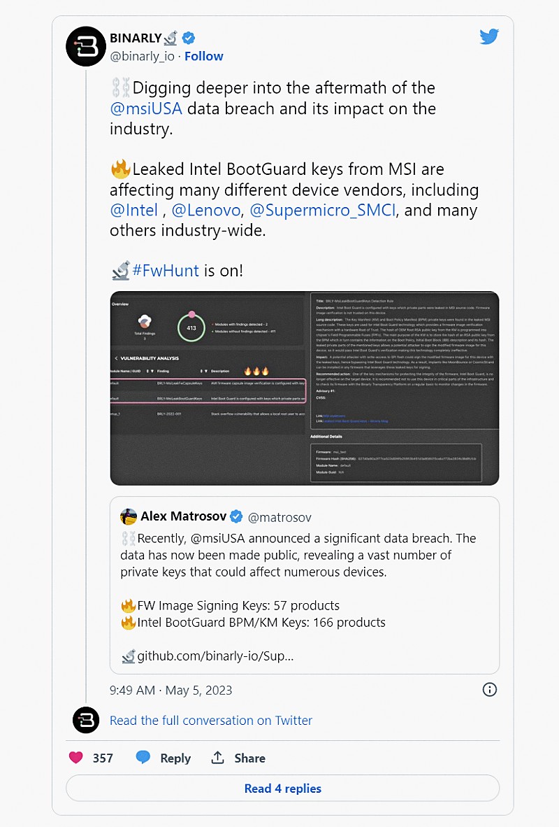 이번에는 MSI 인기 노트북 제품(스텔스, 크리에이터, 크로스헤어, 프레스티지, 펄스, 모던, 레이더, 소드, 서밋, 벡터, 카타나 등)의 펌웨어 코드 보안키가 유출, 악의적인 목적으로 서명키를 남용해 불법 펌웨어를 유통할 수 있는 버그다. 실제 해당 문제를 이용한 가짜 펌웨어가 업데이트 된 장비에서 데이터 유출 사고가 보고됐다.