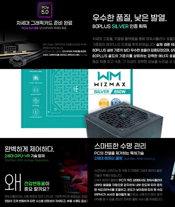 제품은 750W와 850W 두 가지로 구성됐고 엔트리 제품군이지만, 2세대 GPU-VR와 2세대 애프터쿨링 등의 주요 기능을 갖추고 있어 탄탄한 안정성과 준수한 성능을 제공해. 우선 다나와 판매량에서 가장 많은 WIZMAX 850W 80PLUS SILVER ATX3.0 (PCIE5)가 좋은 예가 될 것 같아서 골라봤어.