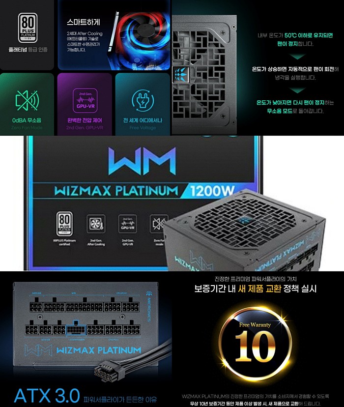 여기선 인기 있는 WIZMAX 1200W 80PLUS PLATINUM 풀모듈러 ATX 3.0 (PCIE5) 제품을 뽑아봤어. 먼저 설명한 기능 이외에 이 제품에서 주목할 가치가 있는 부분을 설명해 볼게.