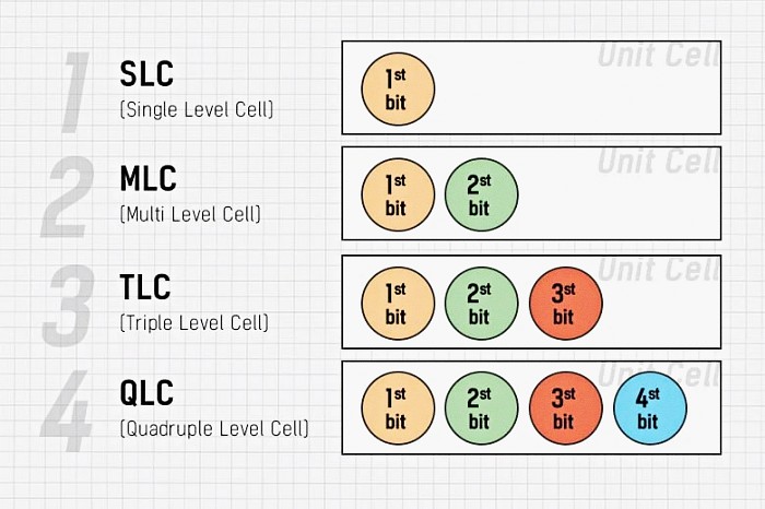 낸드 플래시는 최소 저장 공간 단위인 셀(Cell)에 전자를 넣고 빼는 방식을 써. 나중에 전자가 있고 없는 것에 따라서 1과 0으로 파악해 데이터를 읽고 쓸 수 있는 거지. 그런데 이 셀을 구성하는 방식에 따라서 셀 하나에 비트를 몇 개 저장할 수 있는지가 달라. 셀 하나에 1비트만 넣는 건 SLC(Single Level Cell), 2비트를 넣으면 MLC(Multi Level Cell), 3비트는 TLC(Triple Level Cell), 4비트는 QLC(Quadruple Level Cell)라고 불러.