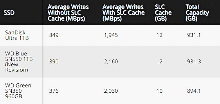 SLC 캐싱은 저장 공간의 일부를 SLC 방식처럼 사용해서 캐시 메모리 역할을 맡겨. 때문에 캐시 메모리 용량보다 작은 파일을 읽고 쓸 때는 SLC의 속도가 나오게 되는데 SN550의 캐시 메모리 용량은 12GB야. 그러니 이전 모델과 신모델 모두에서 사용자가 일상적으로 편안하게 작은 파일을 가끔 쓰고 읽을 때 차이를 느끼기 어렵지. 하지만 때로는 하드 한 작업을 할 때가 있잖아? 이럴 때 용량이 초과되는 부분부터 쓰기 속도가 급격히 느려져.