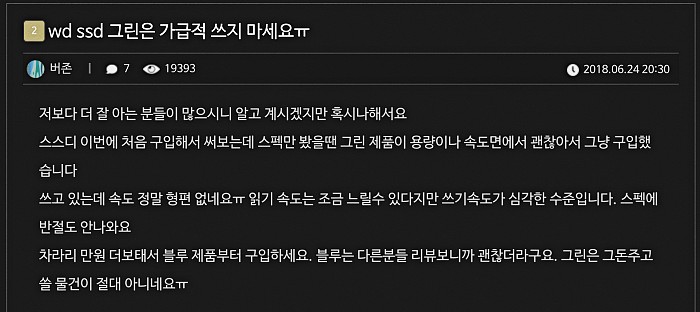 사실 이전부터 WD의 SSD제품군에는 상당한 문제점이 있었어. 2018년 시점에서도 가장 저렴한 제품인 WD SSD그린의 성능이 외부에 밝힌 스펙에 비해 현저히 떨어진다는 불만이 제기됐어. 퀘이사존 사용자 게시판에도 그린 제품의 쓰기 속도가 심각하게 느린데 컨트롤러칩도 그다지 믿을 만하지 않고 디램 캐시도 없기에 그냥 블루 제품 사라는 의견이 나와.