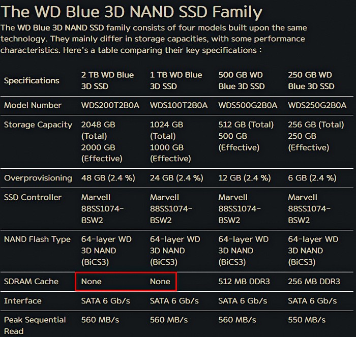 2021년 국내 블로그에서는 WD BLUE 3D SATA SSD 1TB 디램 캐시가 스펙 카탈로그에 없기에 아예 안 달린 거 아니냐는 말까지 나와. 해당 필자는 여러 자료를 들어서 결국 들어있다고 결론 지었지만 WD 측이 이런 스펙 표기에 너무 무성의했다는 점을 지적했어.