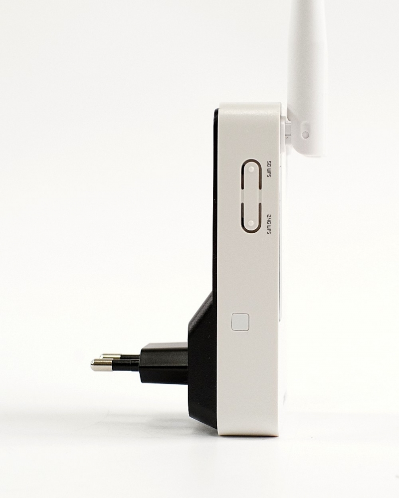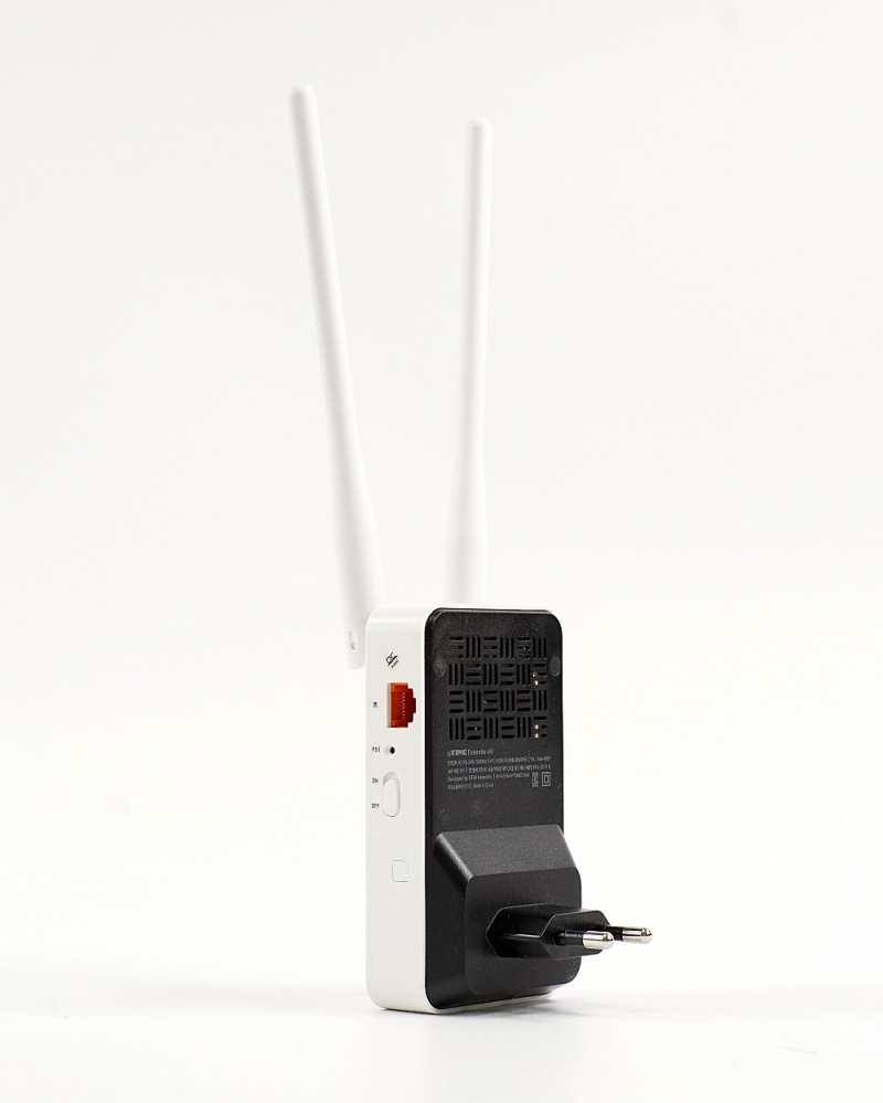 순백색상에 2개 안테나 그리고 상단에 동작을 안내하는 LED. 마치 아이피타임 공유기를 축소해 둔 것을 연상케 한다. LED에는 5G와 2.4G 그리고 전원과 통신을 문구가 있으며 LED로 상태를 안내한다. 단말기는 넓은 면을 기준으로 우측에 100Mbps 속도의 LAN 포트와 ON/OFF 스위치 그리고 리셋 버튼을 배치했고, 왼쪽에 WPS 버튼을 배치해 놨다.