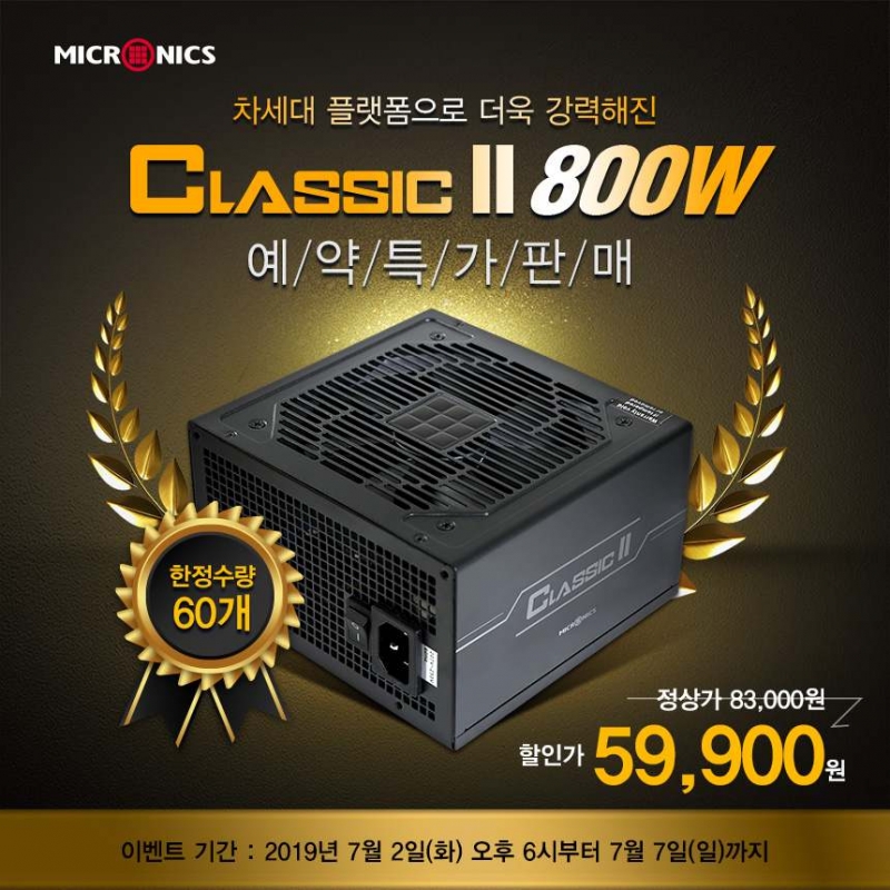 [2019년 07월 02일] - 한미마이크로닉스 (대표 강현민, 이하 마이크로닉스)가 파워서플라이 마이크로닉스 클래식II 시리즈의 800W 제품군 출시를 오는 9일 앞두고 특가 예약 판매를 진행한다. 기존의 500/600/700W 모델에 이어 새롭게 추가하는 라인업으로, 출력과 안정성, 에너지 효율, 팬리스 모드 등, 성능과 기능을 더한 제품이다.