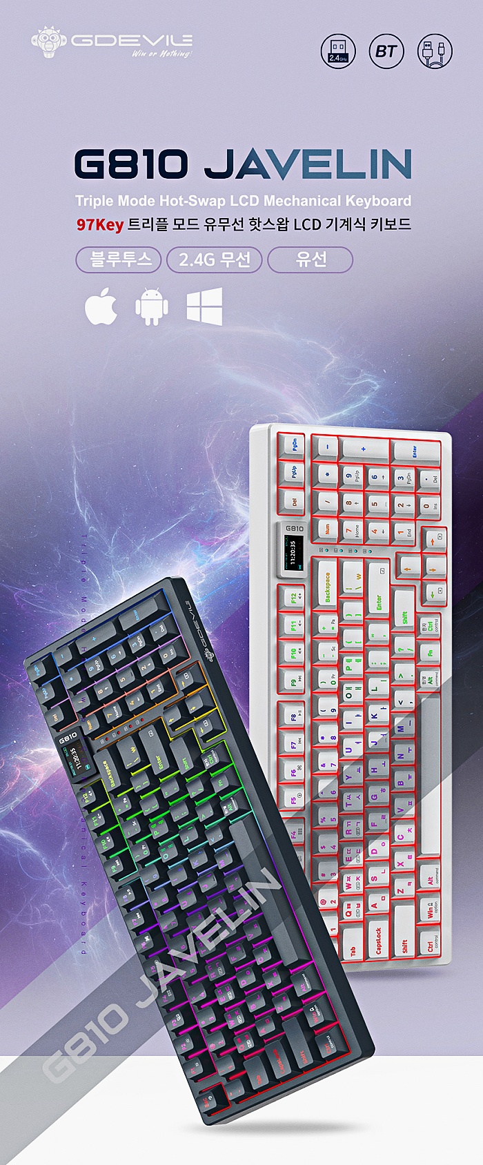 지데빌은 트리플모드 97키 LCD 게이밍 키보드 G810 JAVELIN을 출시했다. 자체 개발 저소음 GD스위치를 메인으로 블루투스 / 무선2.4GHz / 유선 인터페이스를 지원하는 트리플 모드 게이밍 입력기기다.