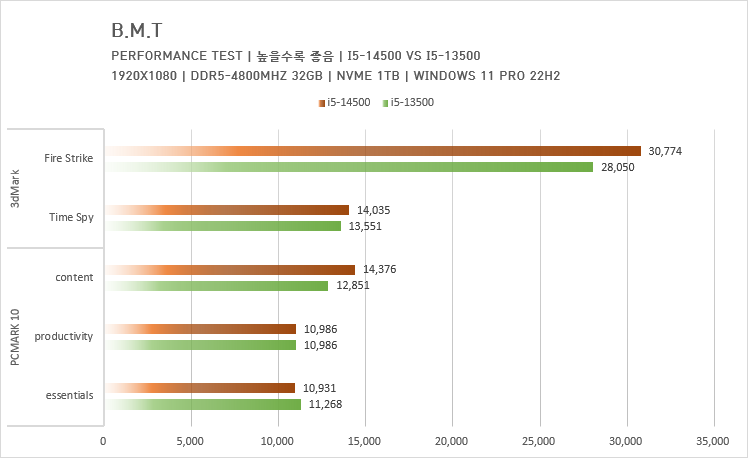 1080P 기준 진행한 테스트 가운데 PC 성능을 측정하는 PC마크를 기준으로 살펴보면 생산성은 13세대와 14세대가 동일한 것으로 확인되었으나 콘텐츠 제작과 주요 성능은 엇갈렸다. 주요 성능은 13세대가 약 200 점 정도 높은 것으로 확인되었으나 오차범위 내의 성능으로 큰 의미를 두긴 어렵다. 하지만 콘텐츠 제작과 연관한 성능은 2,000점 가량 높게 확인됐다. 영상편집 등의 작업에서 14세대 코어 i5-14500이 13세대 코어 시피유 대비 좀 더 유연한 작업 효율을 제공한다는 의미다.