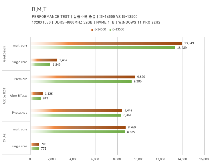 실제 성능을 측정해 보았다. 벤치마크로 나타난 결과는 상당히 괜찮은 수준으로 이전 세대인 i5-13500 대비 전반적으로 성능향상이 확인됐다. 클럭속도 상향이라는 측면에서 접근하자면 실제 성능이 더 높다고 보면 된다. 물론 일부 테스트에서는 비슷한 결과도 확인되었는데, 이는 13세대와 14세대가 최적화 측면에서 개선이 이뤄진 까닭이다.