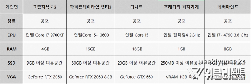▲ 공포 게임 권장 하드웨어 조건 엑셀표