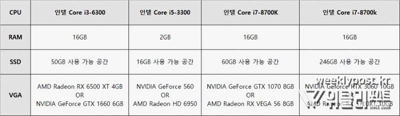 그런데 생각해보자. 여름이 계속 있는 것도 아니고, 아무리 좋은 것도 너무 많이 하면 질린다. 세상에는 공포게임 외에도 재미있는 게임이 더 많이 있다. 더욱 다양한 게임을 쾌적하게 즐기고 싶다면 어떤 사양으로 맞추면 될까? 우선 다른 게임들의 권장 사양을 알아보자.
