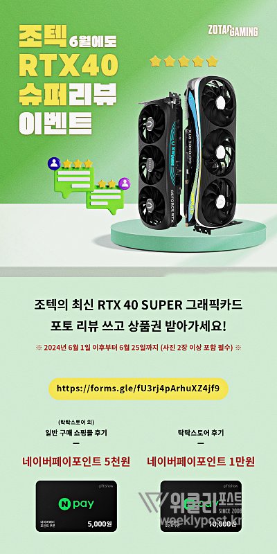 지포스 그래픽카드 전문 기업 조텍코리아(ZOTAC Korea)는 지포스 RTX 40 SUPER 시리즈 그래픽카드 구매자를 대상으로 구매 후기 이벤트를 진행한다고 밝혔다. 2024년 출시된 ‘ZOTAC GAMING GeForce RTX 40 SUPER 시리즈’ 전 제품이 해당된다. 조텍에서 출시한 제품은 다음과 같다: