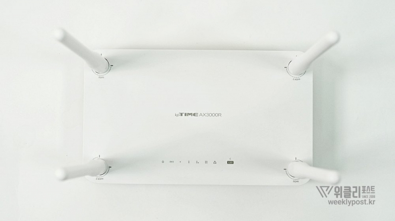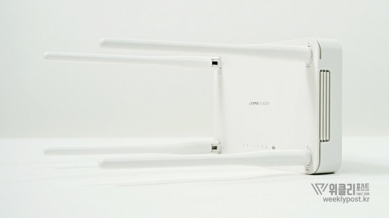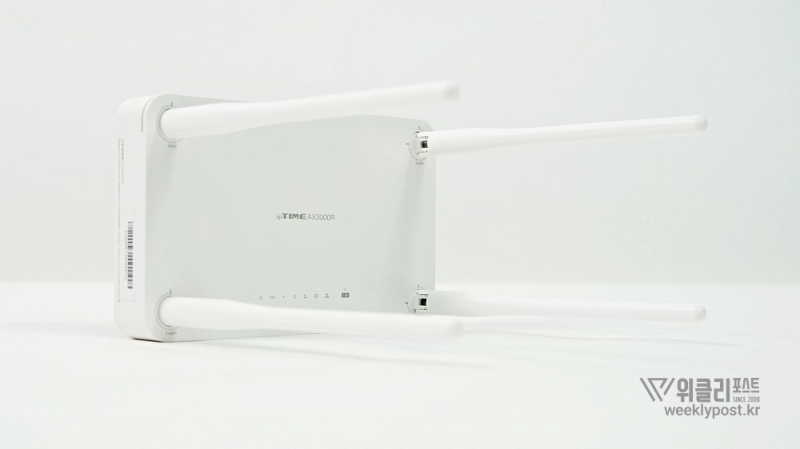 아이피타임 공유기는 마치 애플처럼 일관된 디자인 컨셉을 가지고 있습니다. 미니멀리즘에 가까운 직관적 형태와 화이트 앤 블랙의 깔끔한 색상이 특징입니다. 아이피타임 AX3000R 역시 그런 컨셉을 잘 계승했습니다. 얇은 직사각형 박스형 본체에 방향과 각도 조절이 가능한 막대형 안테나 4개가 장착된 모습을 하고 있습니다. 안테나는 방향과 각도를 자유롭게 조절할 수 있습니다.
