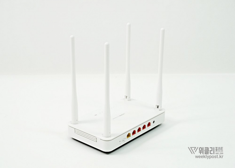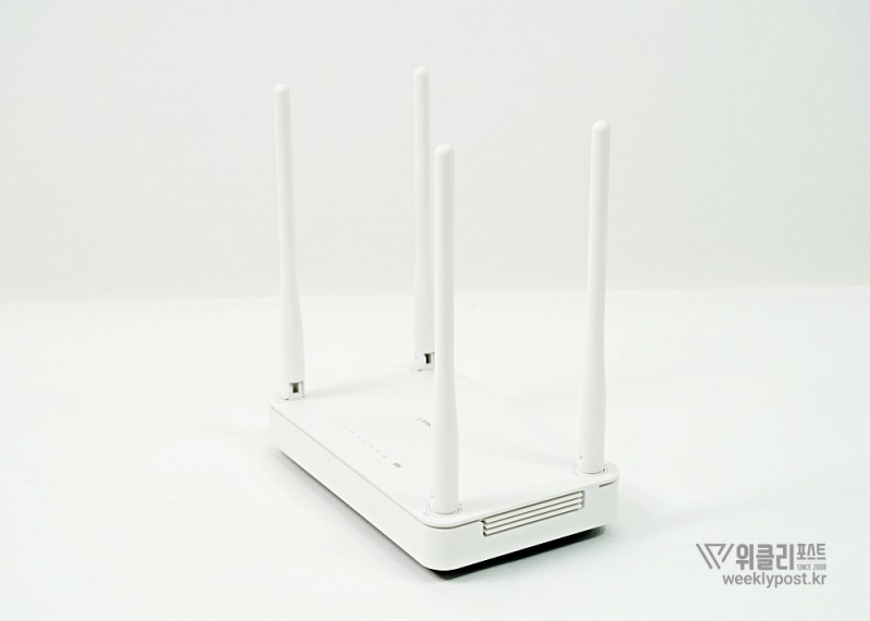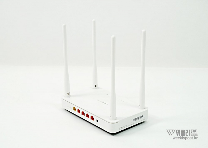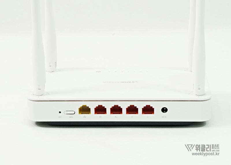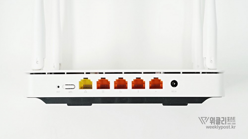 후면에는 리셋 핀홀, 쉬운 무선랜 연결을 위한 WPS 단자, 노란색 이더넷 입력 단자 1개, 오렌지색 이더넷 출력 단자 4개, 어댑터 전원 입력 단자가 가로로 배치되었습니다. 기능에 따라 다른 색깔을 사용해 초보 사용자도 혼동 없이 즉각 연결할 수 있으며, 요란하지 않아 집안 인테리어 미관을 해치지 않습니다.