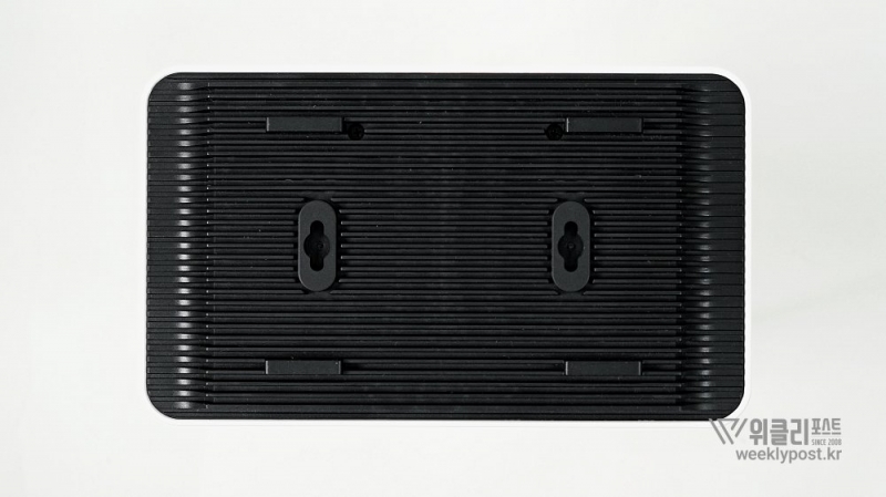 전체적으로는 기능성과 디자인이 잘 조화된 형태가 돋보입니다. 화이트 플라스틱 재질로 만들어졌으며, 화려한 외관보다는 기능성과 인테리어에 잘 어울리는 외형을 추구했습니다. 바닥면에는 공기를 빨아들이는 흡기구 홀이 있고, 전면과 측면 상단에 뜨거운 공기를 배출하는 방열 슬롯이 있습니다.