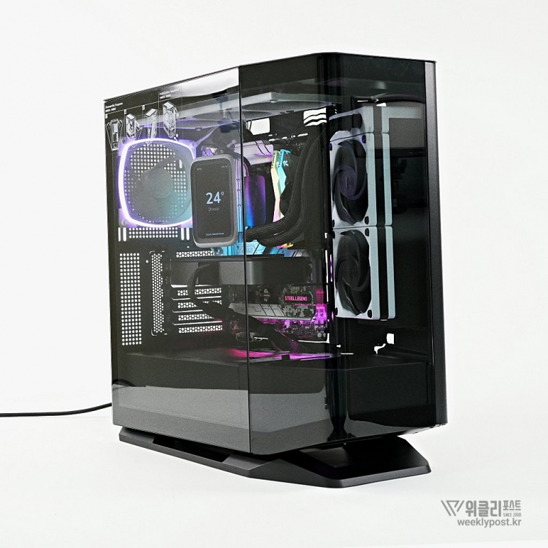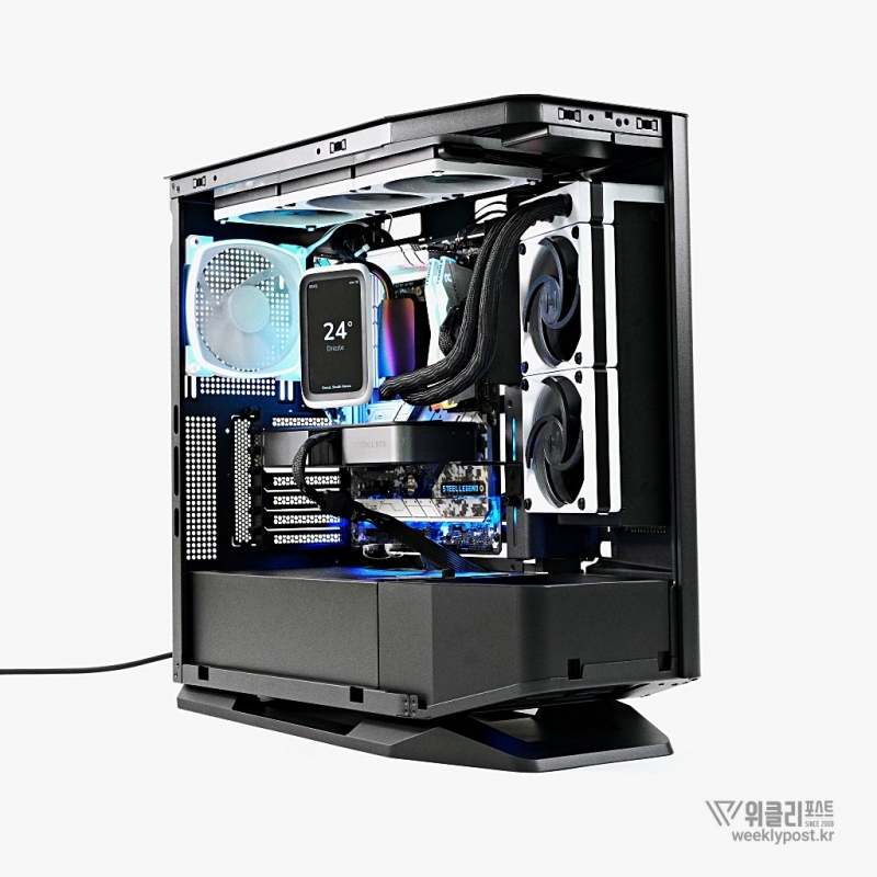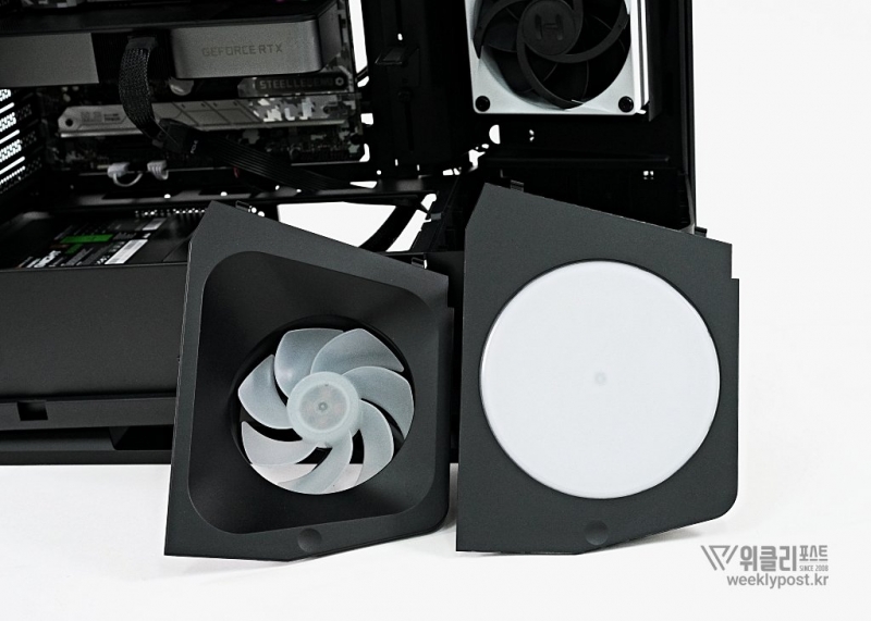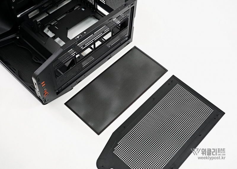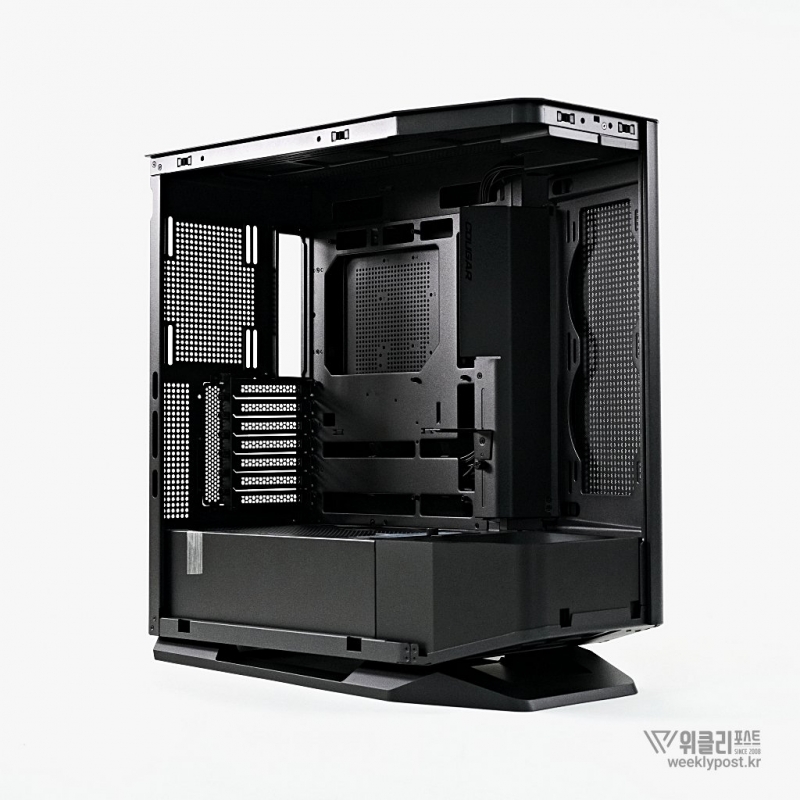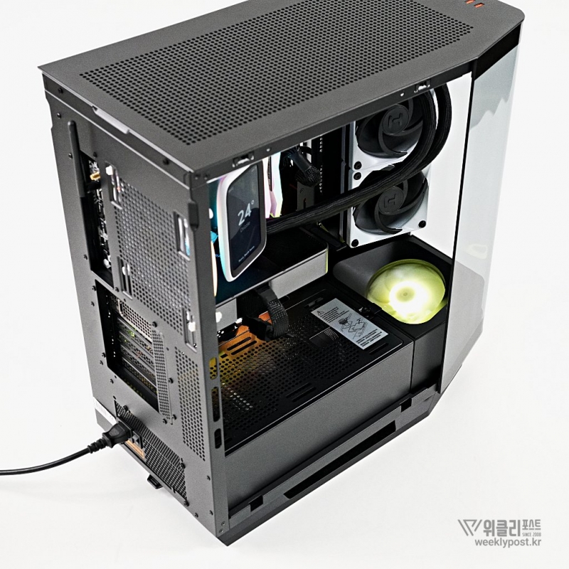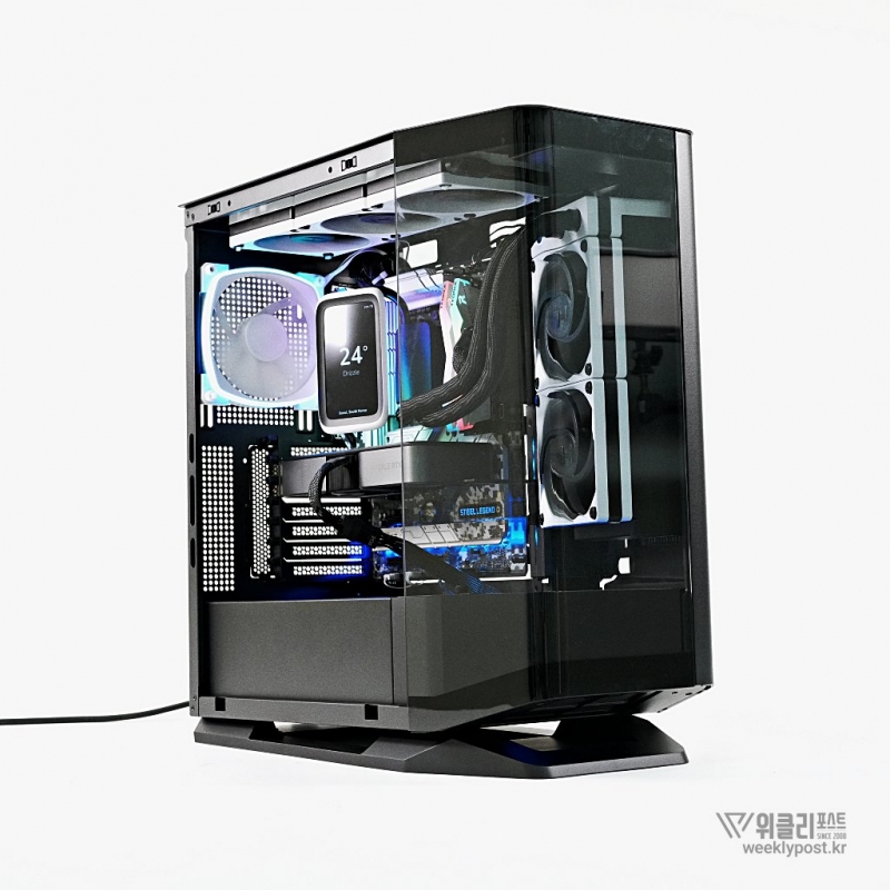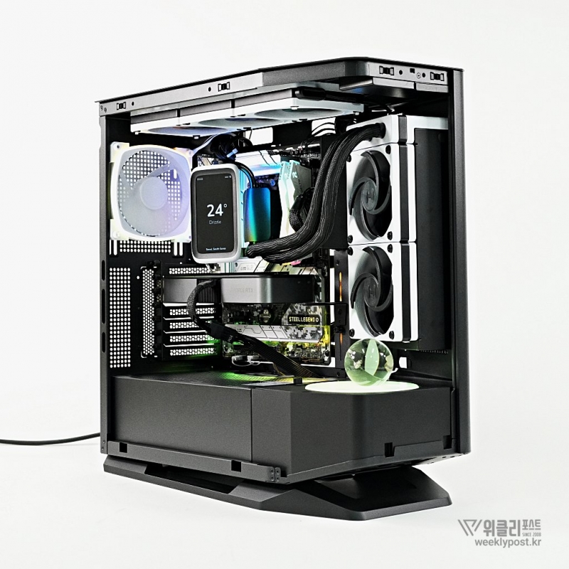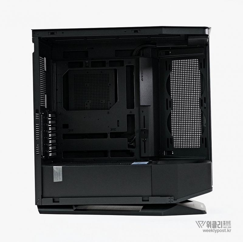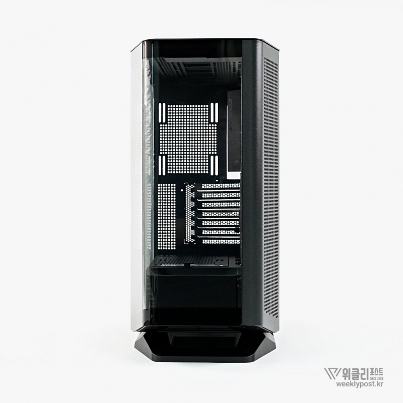 먼지 필터는 당연히 지원된다. 상단, 하단, 측면 모두에 골고루 부착되어 있어 먼지 유입을 방지한다. 케이블 정리 홀도 마련되어 있어 깔끔하게 정돈할 수 있다. 그래픽카드는 처짐 방지 지지대가 기본 적용된 것도 주목할 만한 특징이다. 이 외에도 쿨링팬은 최대 120mm 9개, 140mm 7개까지 장착할 수 있다.
