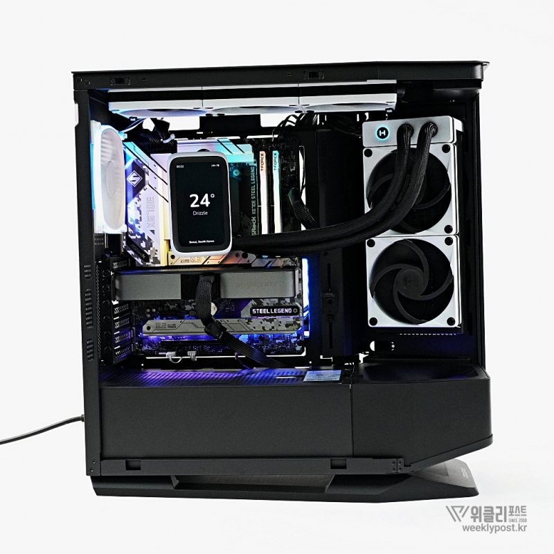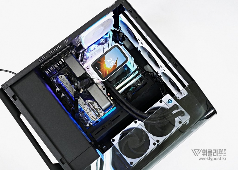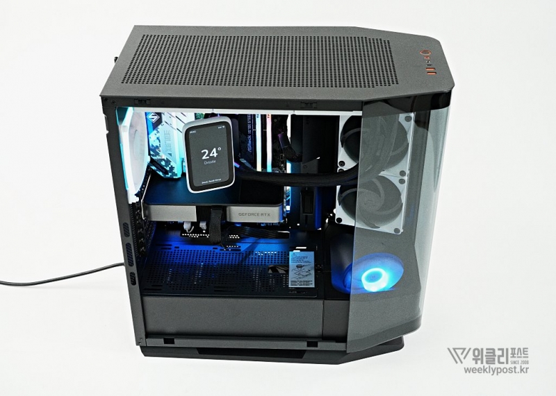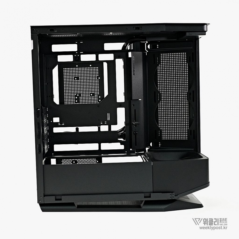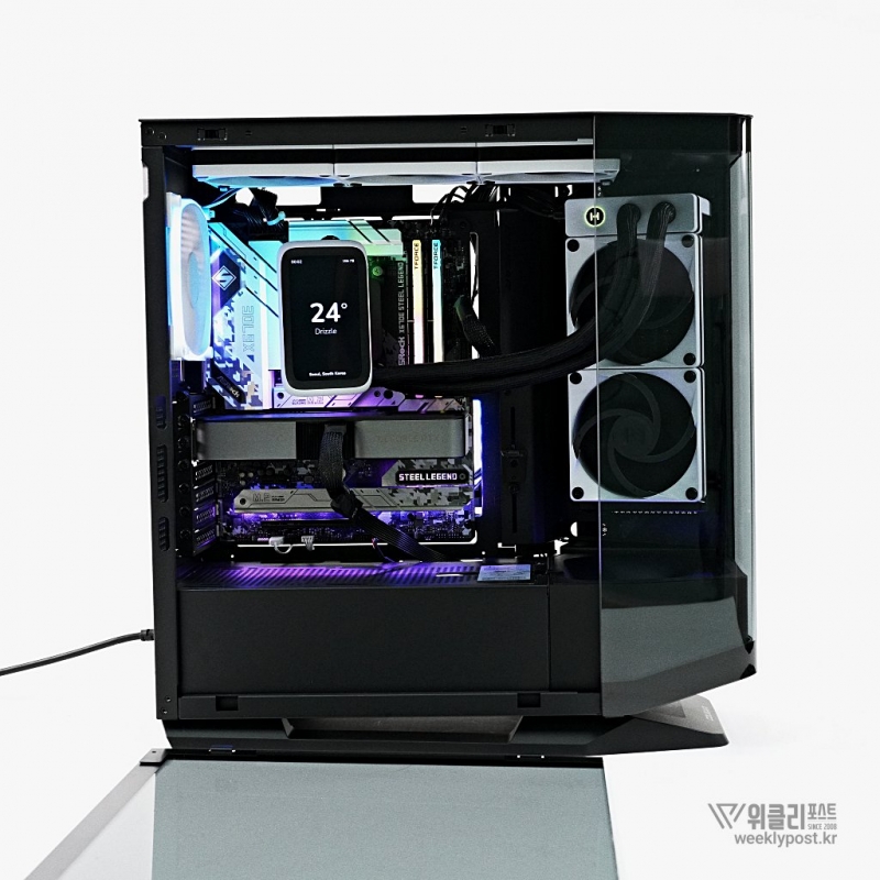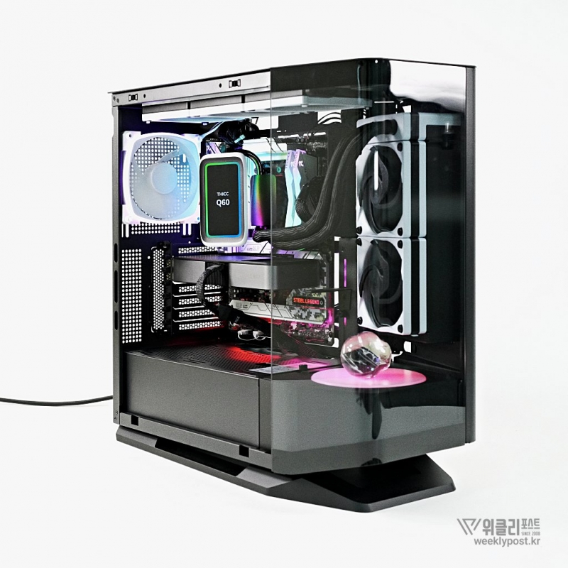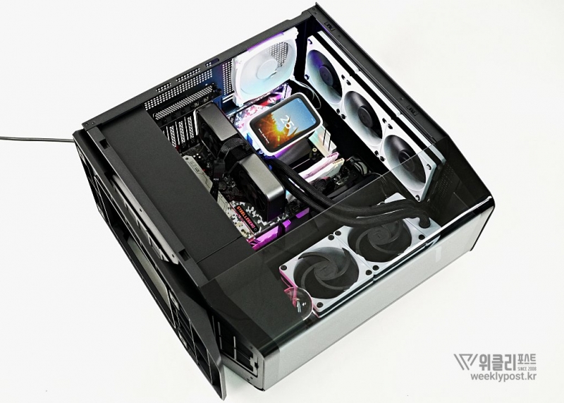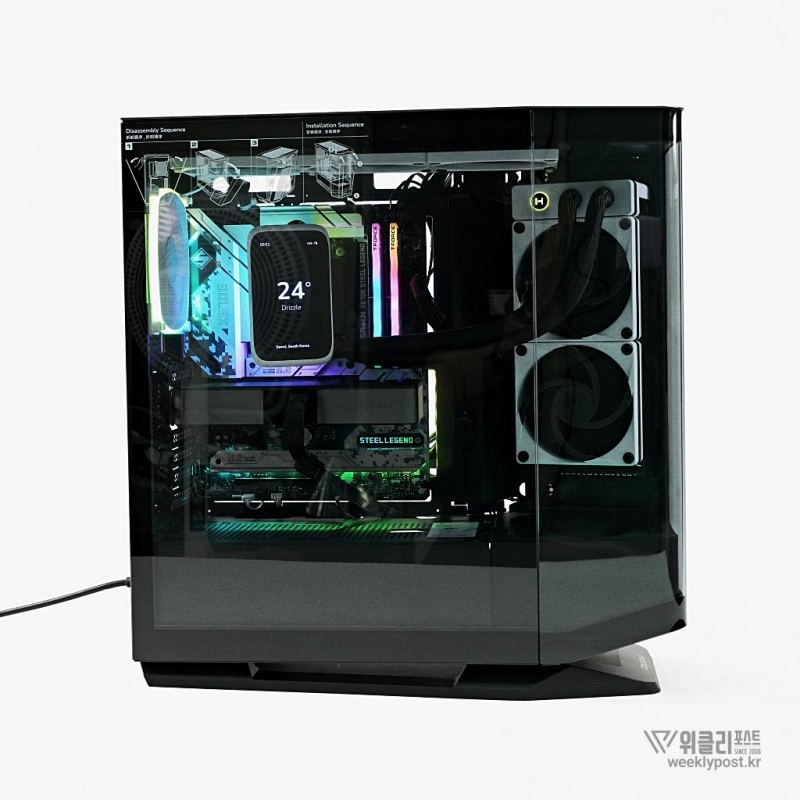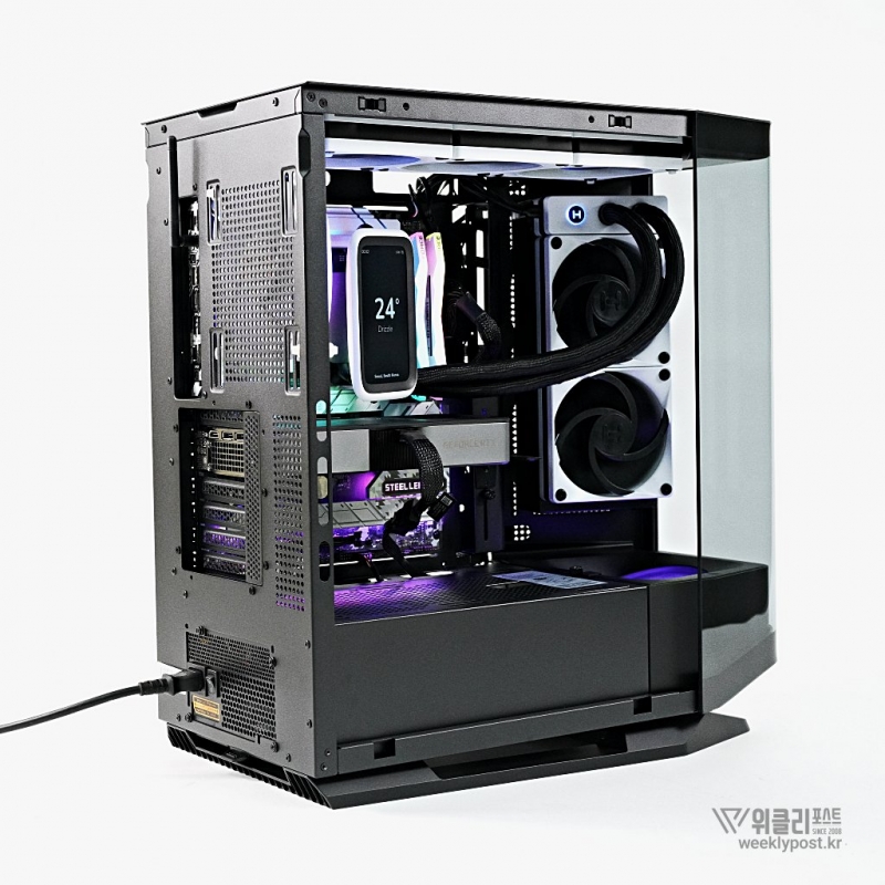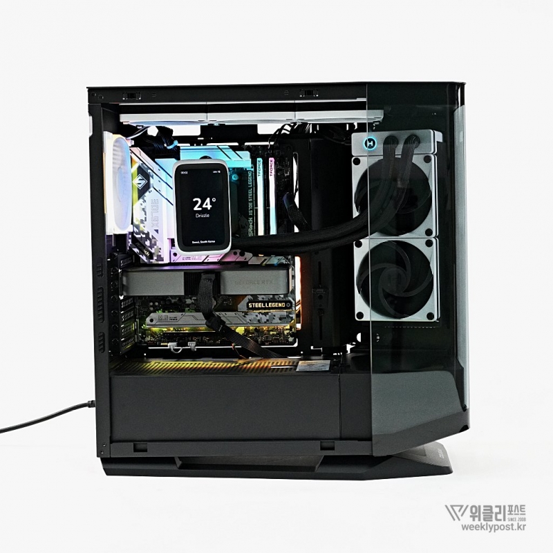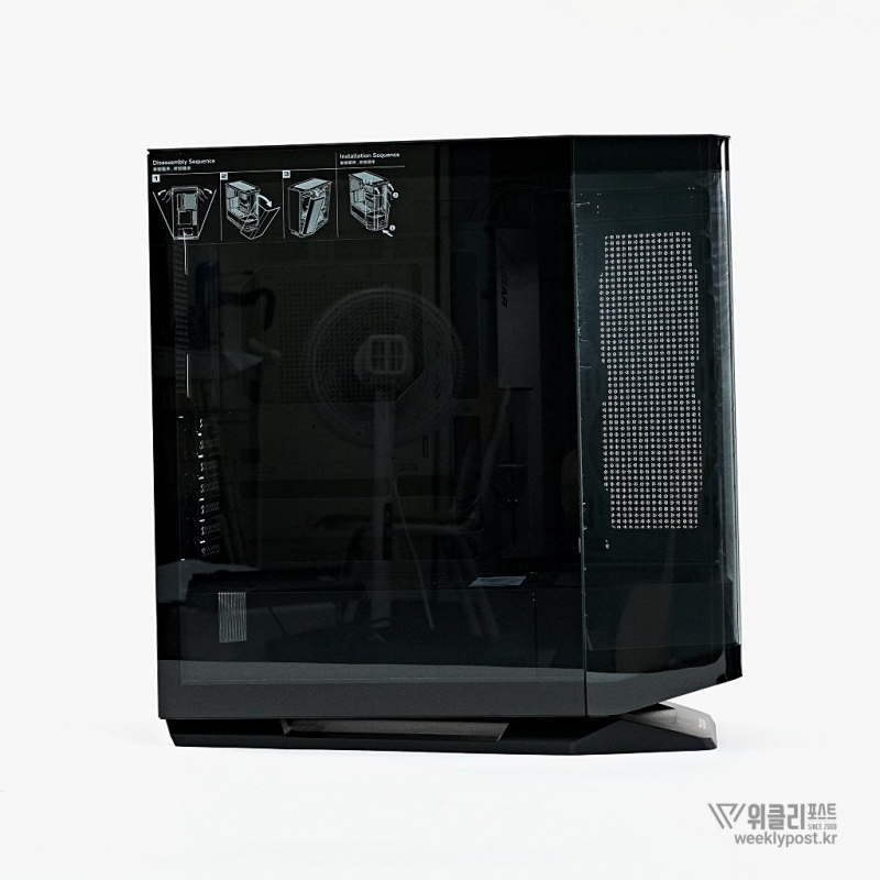 먼지 필터는 당연히 지원된다. 상단, 하단, 측면 모두에 골고루 부착되어 있어 먼지 유입을 방지한다. 케이블 정리 홀도 마련되어 있어 깔끔하게 정돈할 수 있다. 그래픽카드는 처짐 방지 지지대가 기본 적용된 것도 주목할 만한 특징이다. 이 외에도 쿨링팬은 최대 120mm 9개, 140mm 7개까지 장착할 수 있다.