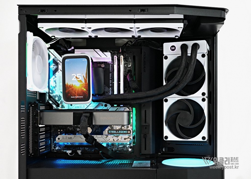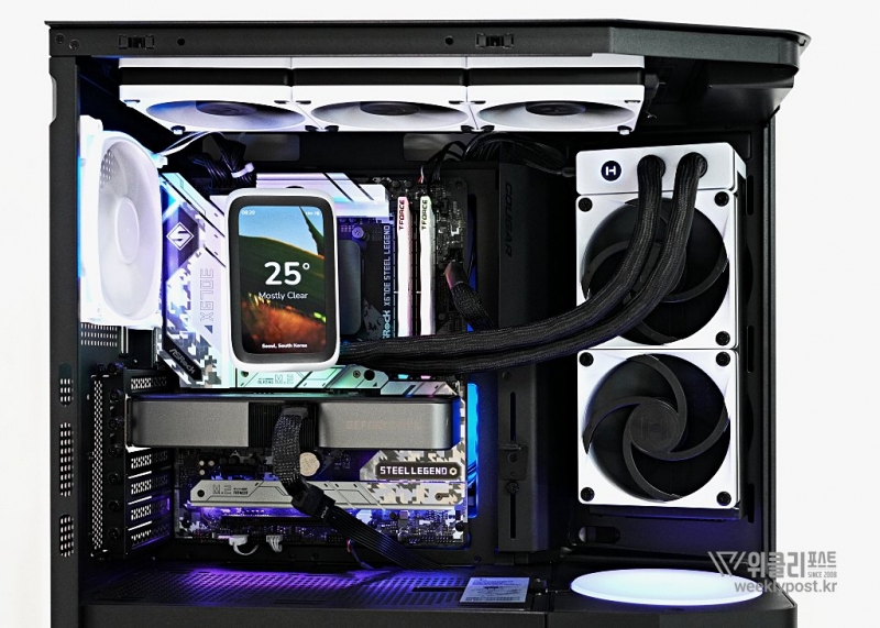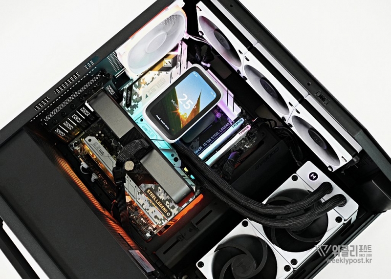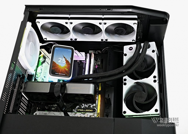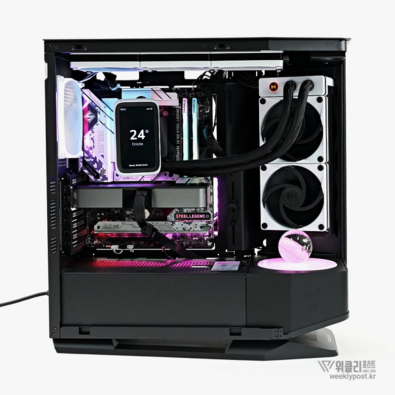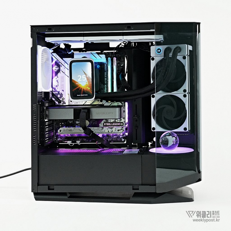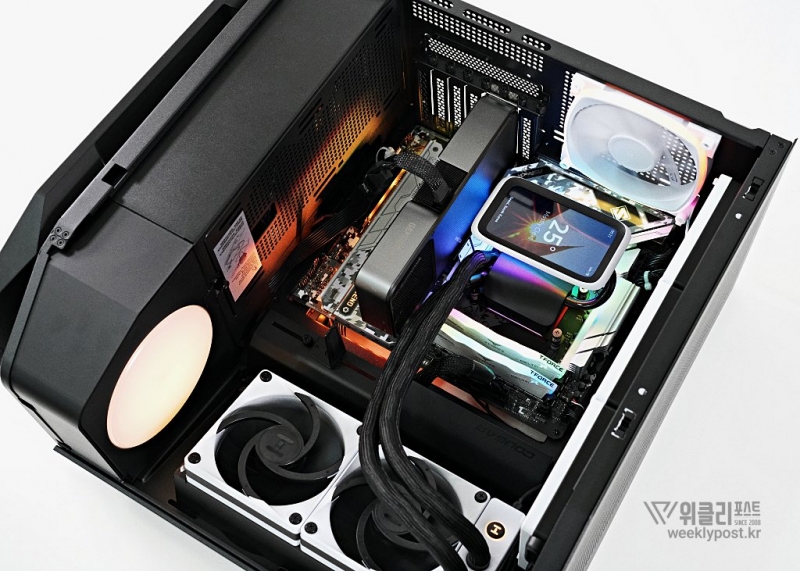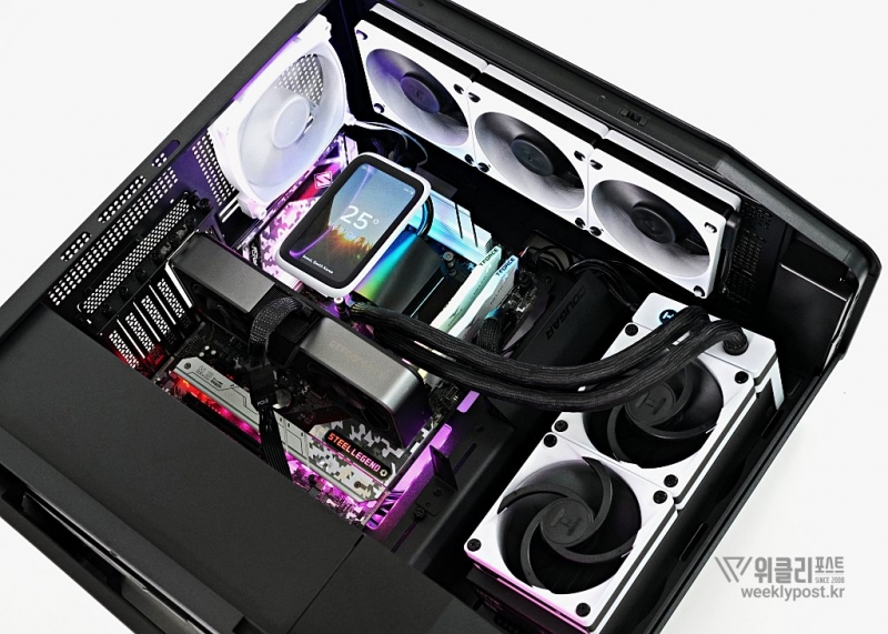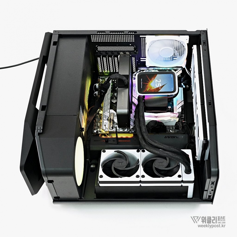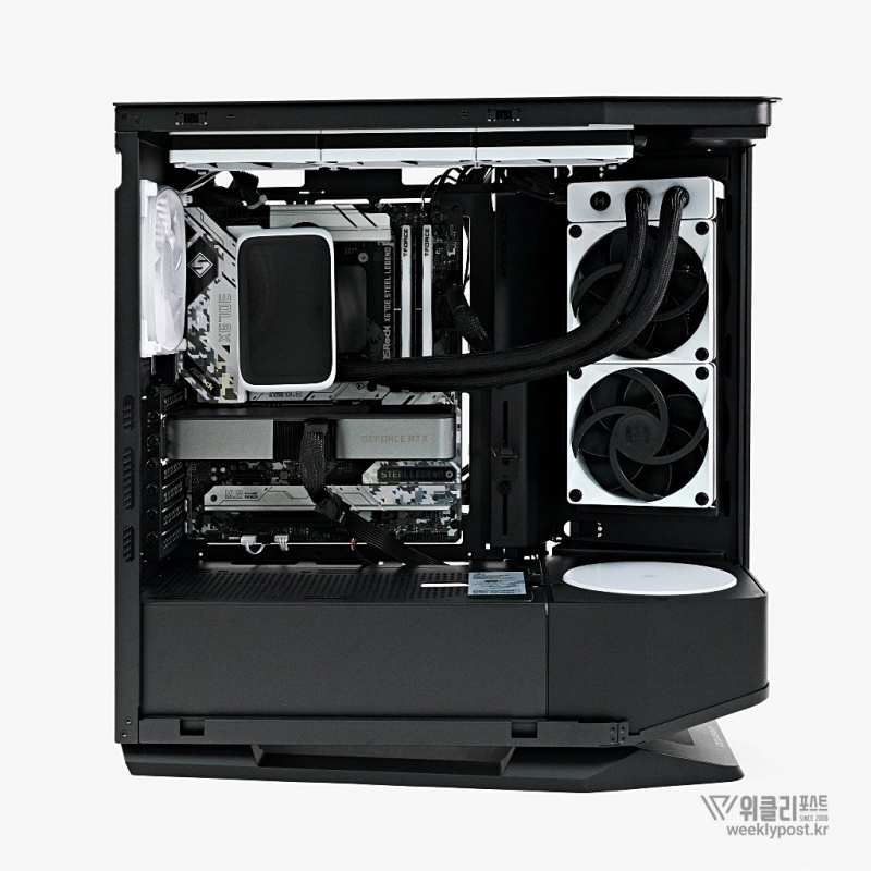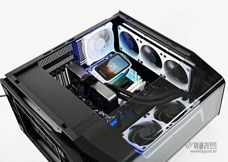 먼지 필터는 당연히 지원된다. 상단, 하단, 측면 모두에 골고루 부착되어 있어 먼지 유입을 방지한다. 케이블 정리 홀도 마련되어 있어 깔끔하게 정돈할 수 있다. 그래픽카드는 처짐 방지 지지대가 기본 적용된 것도 주목할 만한 특징이다. 이 외에도 쿨링팬은 최대 120mm 9개, 140mm 7개까지 장착할 수 있다.