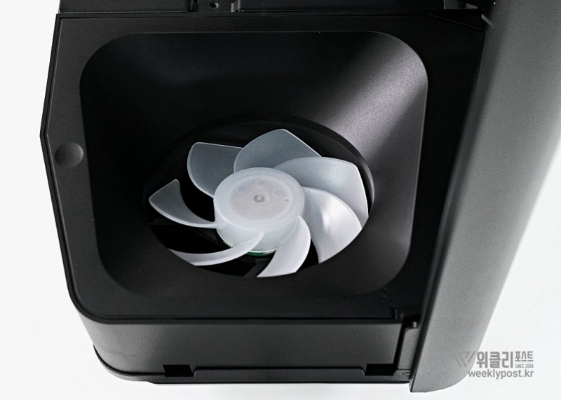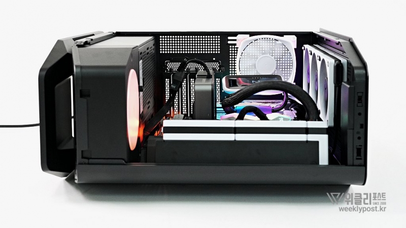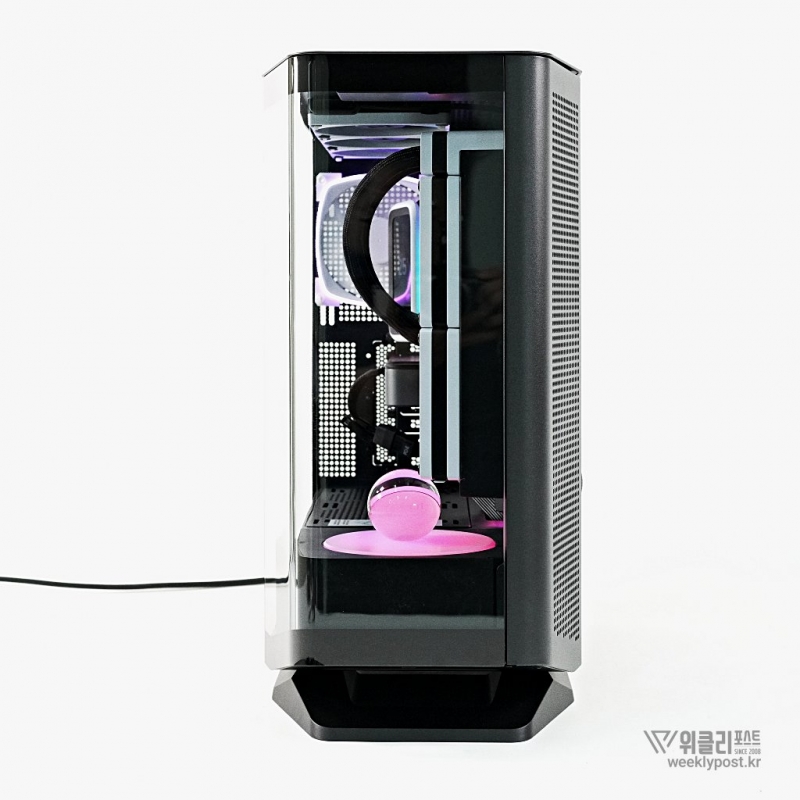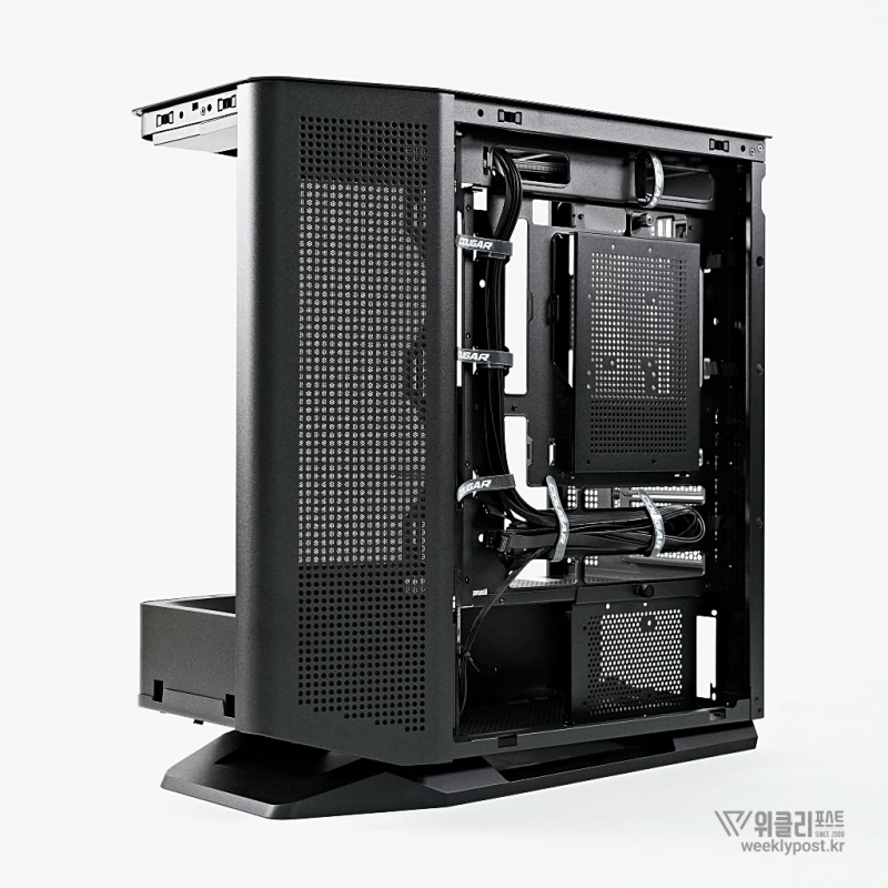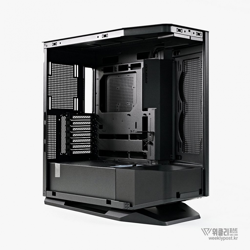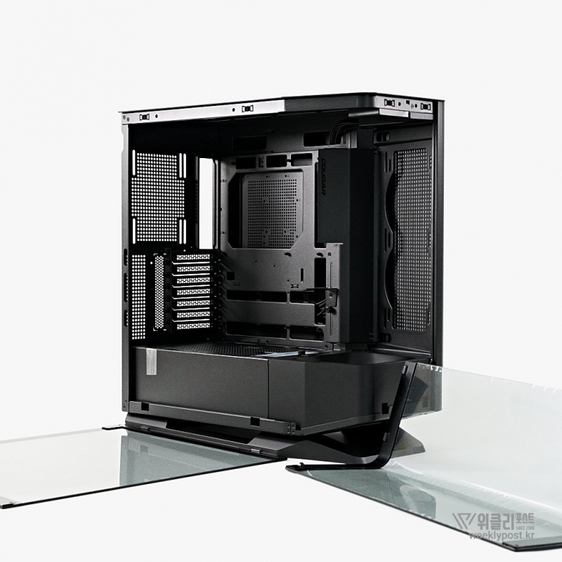 쿠거는 여기서 그치지 않고 조금 더 나아갔다. 전면 하단에 120mm 리버스 쿨링팬을 장착하여 흡기 추가 설계를 했다. 이는 어항 케이스의 단점을 영민하게 해결한 것이다. 게다가 전면부에 기본 장착된 120mm 쿨링팬을 교체할 수 있도록 설계되어, 이를 루미너스 로테이팅 플랫폼으로 변신시킬 수 있다.