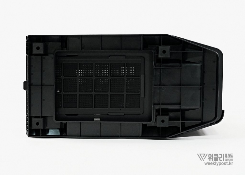 또한, 자세히 보면 특이함을 알 수 있다. 전면부가 하단에서 약 5cm 가량 떠 있는 모습이다. 그 무거운 어항 케이스의 전면부가 공중에 떠 있는 것은 평범한 케이스에서는 보기 쉽지 않은 디자인이다. 하지만 이것도 다 이유가 있다.