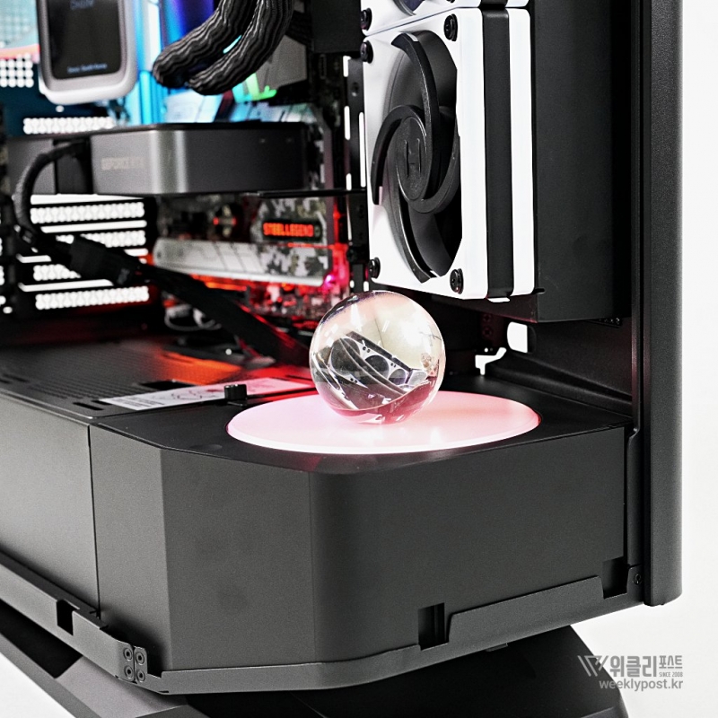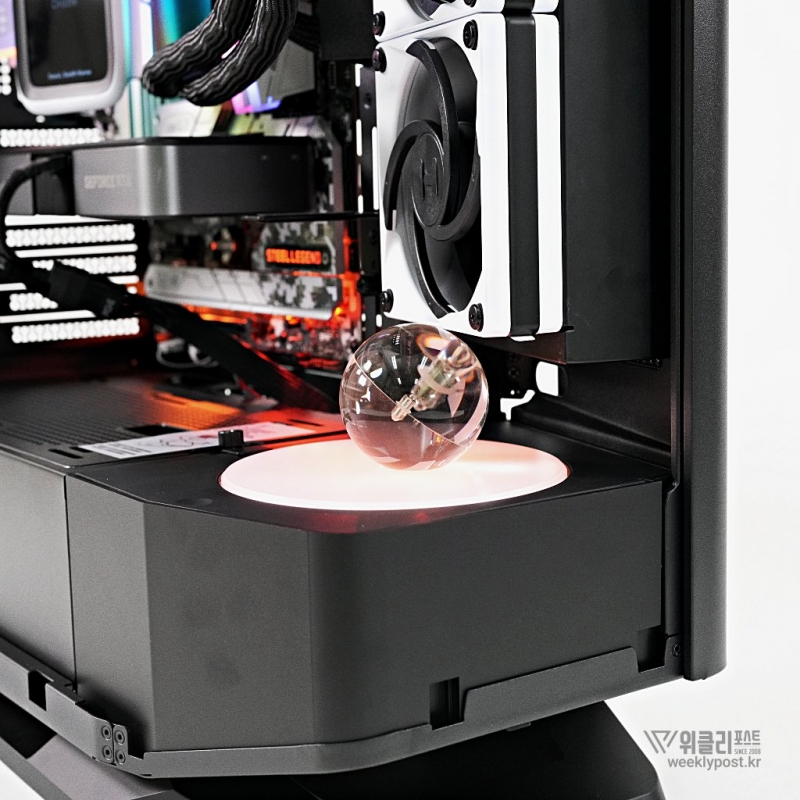 이 루미너스 로테이팅 플랫폼은 360도로 회전하는 번쩍번쩍 턴테이블로, 쿠거 FV270 전용 액세서리다. ARGB 조명이 내장된 턴테이블 같은 모습으로, 본체 내부에 피규어 같은 소품을 전시할 때 유용하다. 하단에 위치한 ARGB 조명과 맞물려 화려한 쇼케이스를 연출할 수 있으며, 시스템 ARGB 구성과 동기화시킬 수 있다.