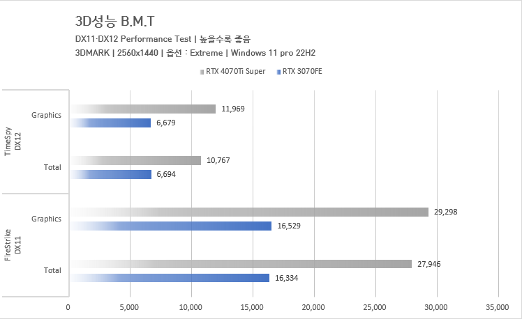 3Dmark를 통해 기본 성능을 살펴보면, RTX 4070 Ti에 비래 6~10% 가량 성능이 향상된 것을 확인할 수 있다. 약간의 오버클럭이 곁들여진 버전임을 감안하면 역시 레퍼런스보다는 살짝 추가적인 성능향상이 이루어진 것도 확인할 수 있다.