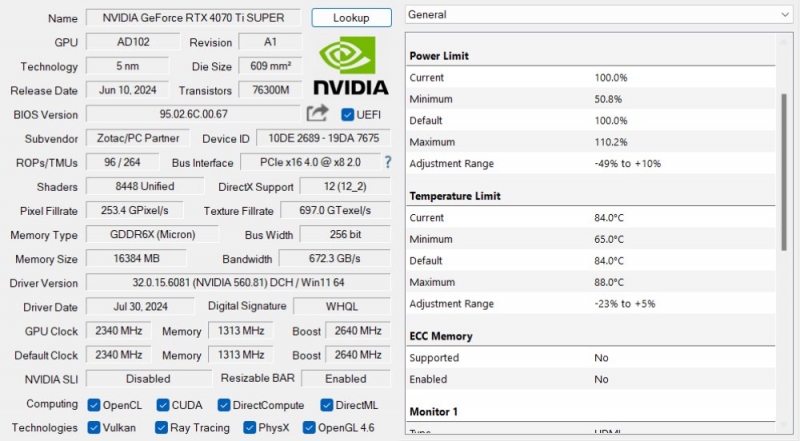 지난 1월에 출시된 동일 GPU 기반의 AMP Holo와 모든 스펙이 완벽하게 동일하다. GPU의 동작 속도는 2340MHz이며, 부스트 클럭이 인가되면 최대 2640MHz로 동작한다. RTX 4070 Ti SUPER의 기본 클럭에서 약간의 오버클럭이 적용되었다. 8448개의 쿠다(CUDA) 프로세서와 스트림 프로세서를 내장하고 있으며, 메모리는 21000MHz로 동작한다.