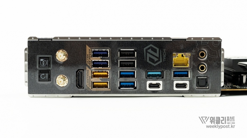 USB 포트: 후면 2 x USB 4 Type-C, 2 x USB 3.2 Gen2 Type-A, 3 x USB 3.2 Gen2 Type-A, 7 x USB 3.2 Gen1 Type-A, 라이트닝 게이밍포트 2 + 울트라 USB 포트 2