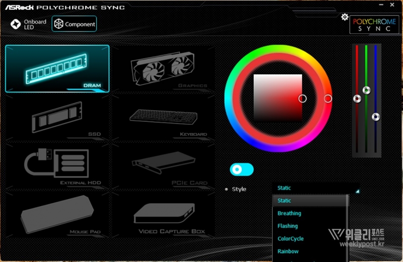 메인보드 제조사마다 지원하는 RGB 소프트웨어와 동기화되므로 RGB를 지원하는 주변의 하드웨어와 동일한 조명효과를 부여할 수 있는 것은 물론이다. ADATA의 하드웨어 위주로 구성된 PC라면 독자적인 RGB 제어 소프트웨어인 XPG PRIME를 이용해 모든 XPG 시리즈의 RGB를 제어할 수도 있다.